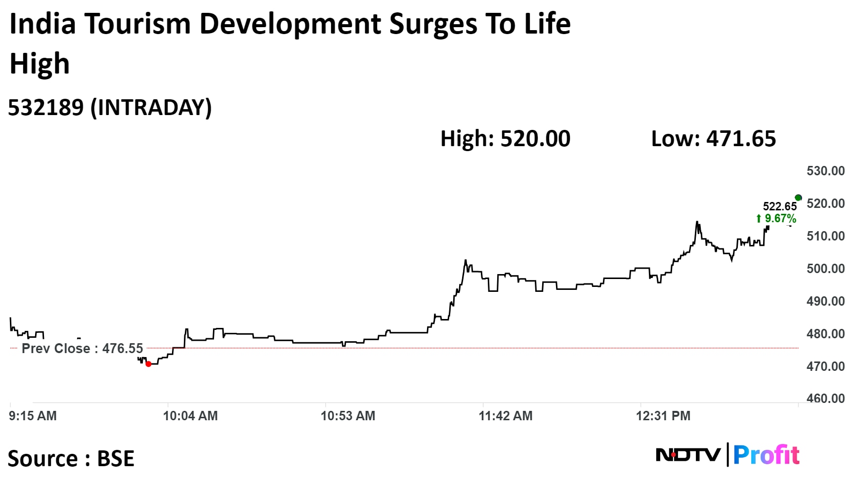 Scrips of India Tourism Development Corp Ltd surged 9.01% to Rs 519.80. It was trading 8.65% higher at Rs 518.10 as of 1:22 p.m. This compares to 0.77% advance on NSE Nifty 50 index.
