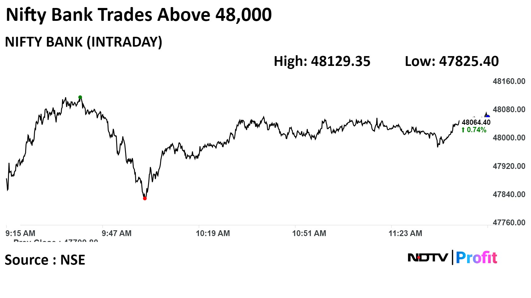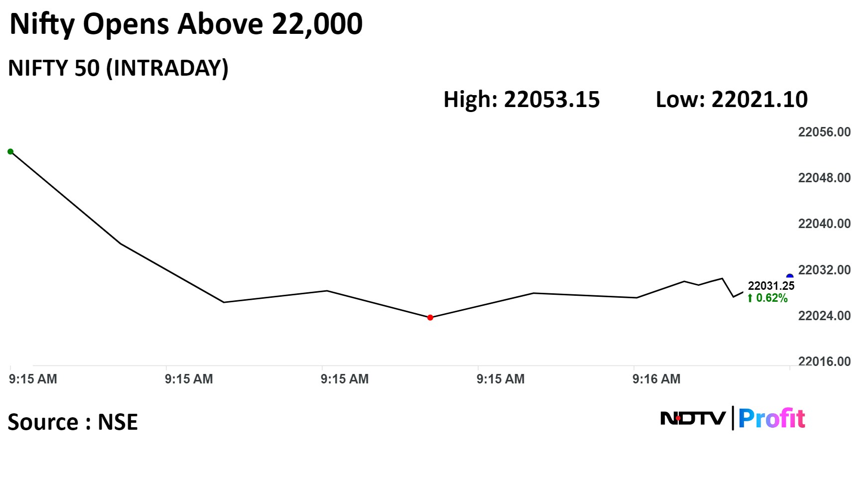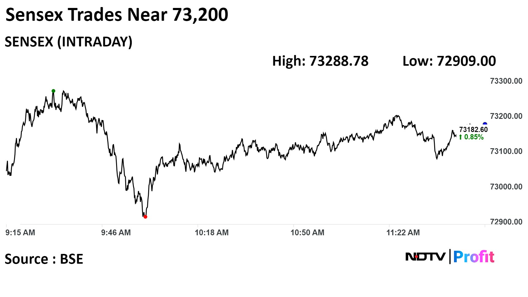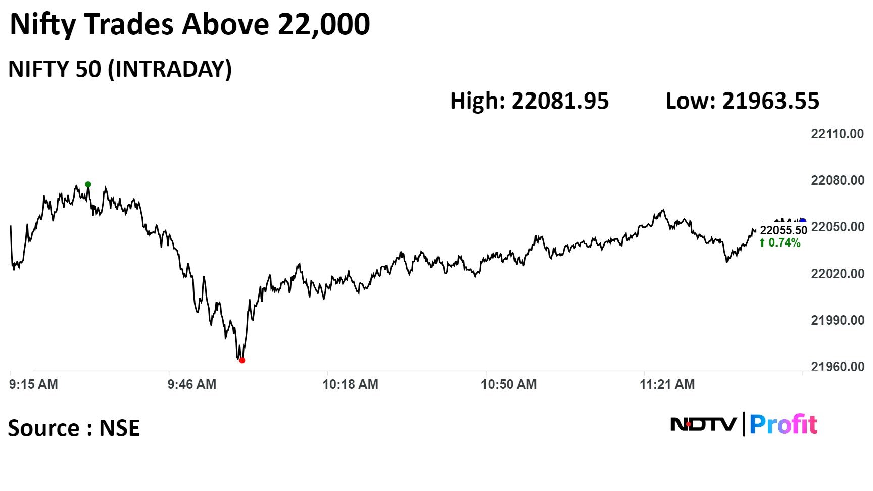At 12:06 p.m., the NSE Nifty 50 rose 157.50 points, or 0.72%, to 22,051.60, while the S&P BSE Sensex gained 586.32 points, or 0.8%, to 73,154.77. The Nifty and Sensex hit record highs of 22,081.95 and 73,288.78, respectively.