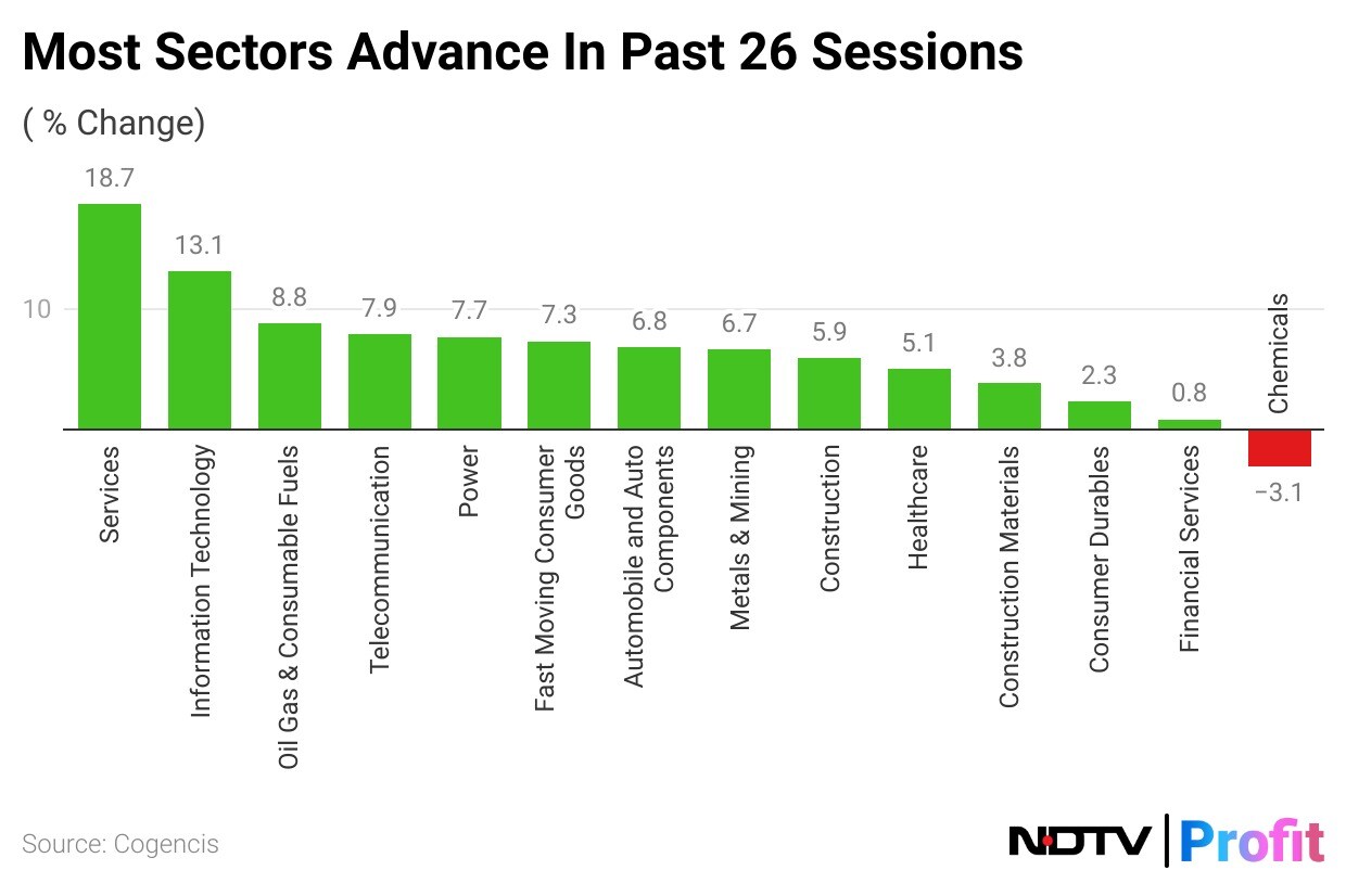 Most sectoral indices on the NSE gained, with Nifty IT, Nifty Oil & Gas, Nifty Pharma, and Nifty Energy gaining over 1%. Nifty Media fell 1.4%.
