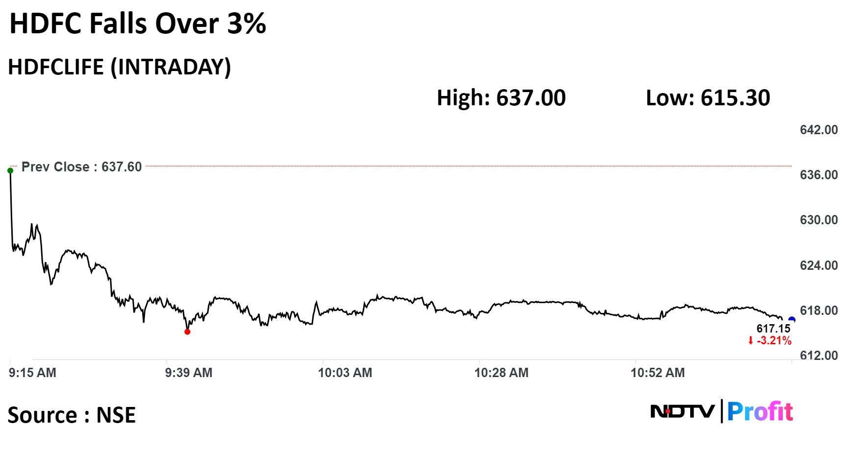 HDFC Life Insurance Company Ltd fell as much as 3.50% to Rs 615.30, the lowest level since Nov 13, 2023. The scrip was trading 3.25% lower at Rs 616.85 as of 11:39 a.m. This compares to 0.63% advance on NSE Nifty 50 index.