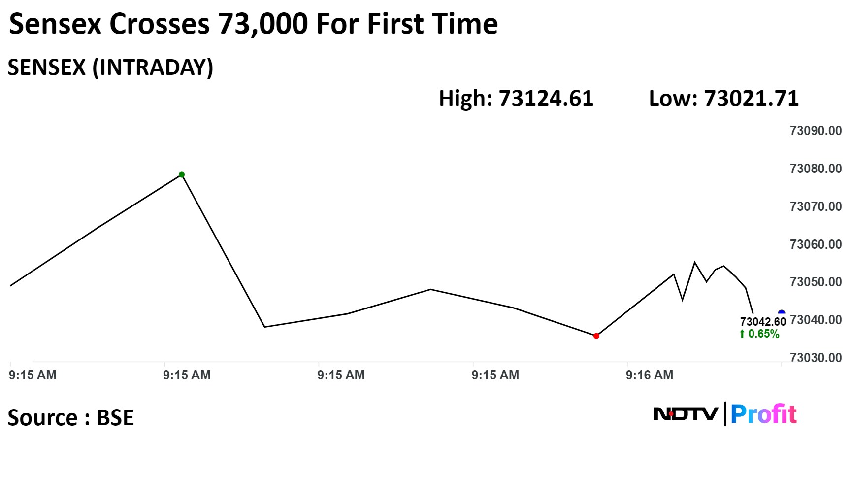 The Nifty 50 index touched a record high of 22,115.55, and Sensex rose to a fresh high of 73,402.16.