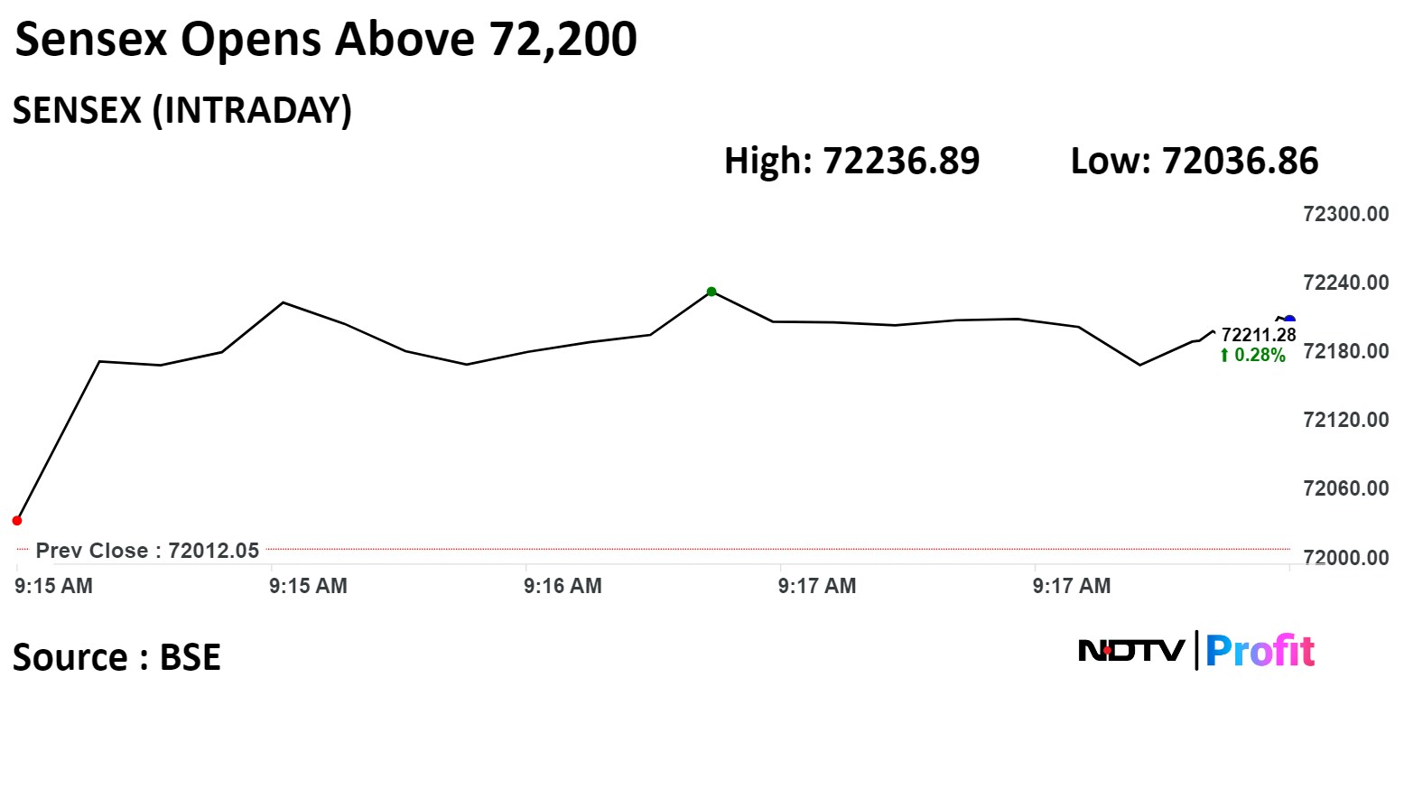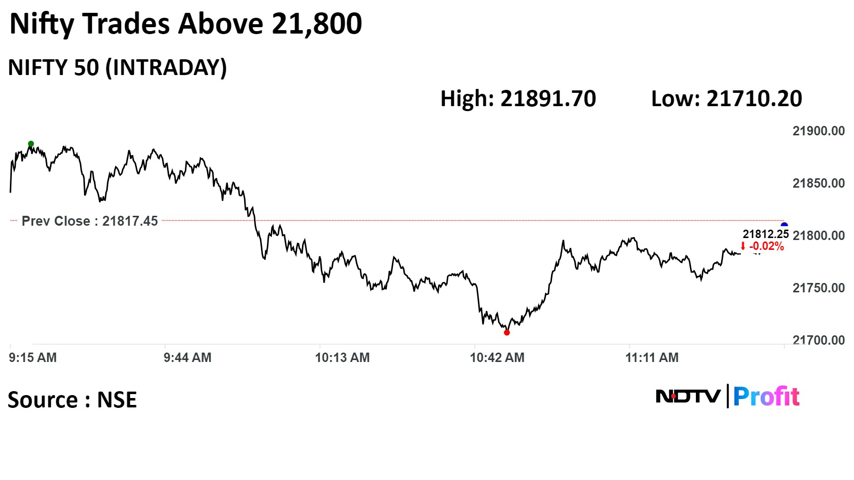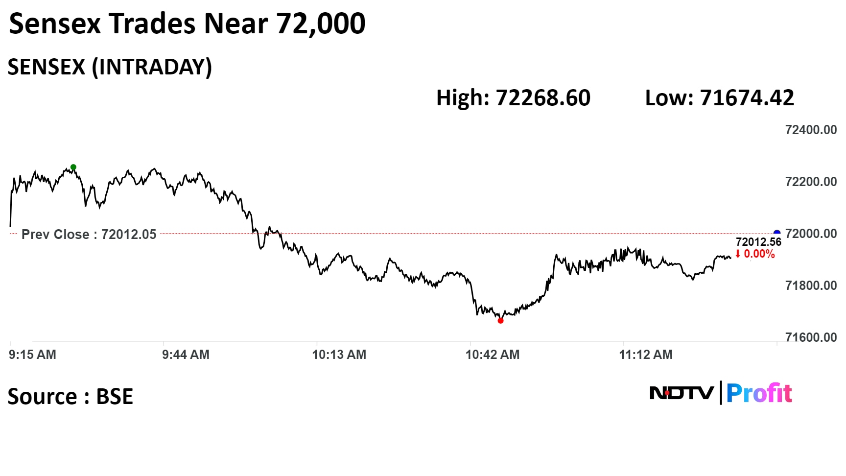 At 11:51 a.m., the Nifty traded 28.85 points, or 0.13%, higher at 21,846.30, while the Sensex gained 113.45 points, or 0.16%, to trade at 72,125.49.