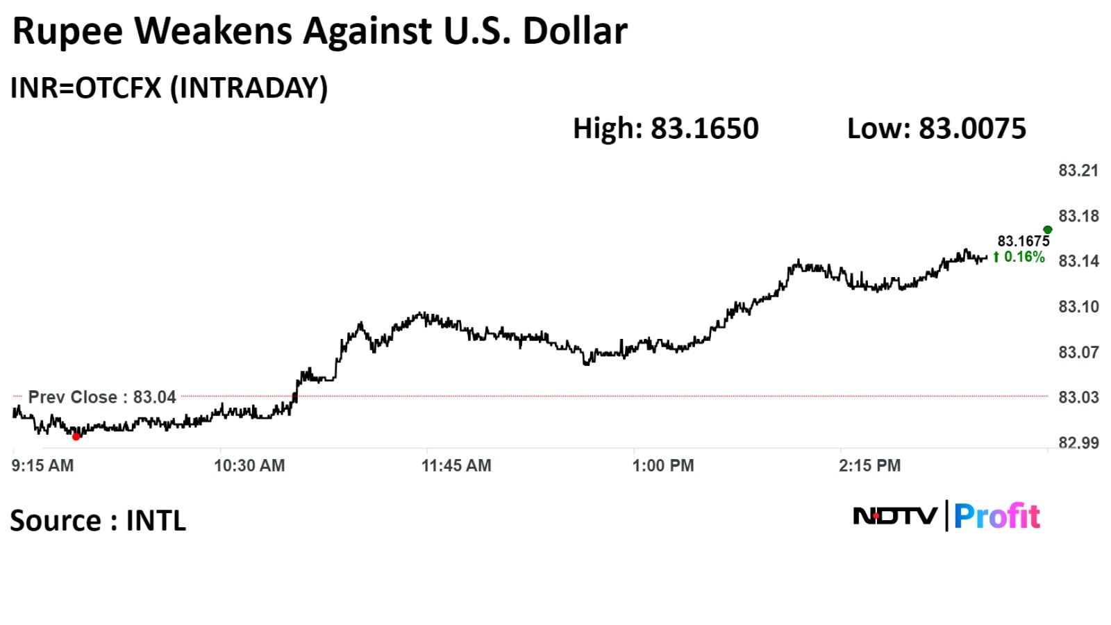The local currency weakened by 13 paise to close at 83.17 against the U.S. Dollar, marking the lowest level in near one-month.
