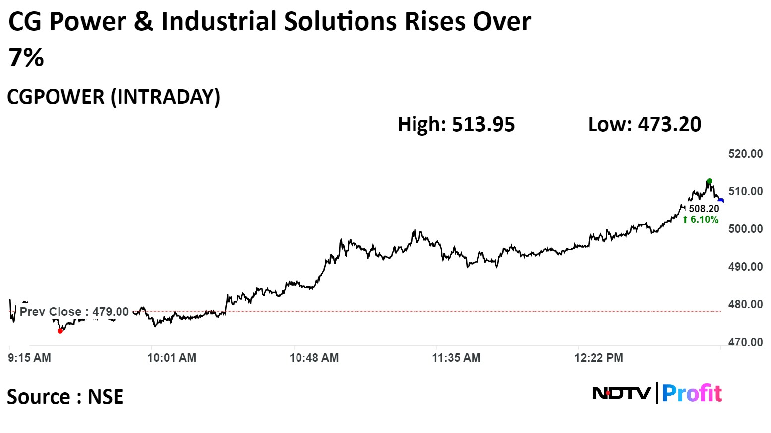 CG Power & Industrial Solutions Ltd. rose as much as 7.30% to Rs 513.95 apiece, the highest level since its listing on Jul 2, 1997. It was trading 5.31% higher at Rs 504.45 apiece, as of 1:14 p.m. This compares to a 0.42% advance in the NSE Nifty 50 Index.