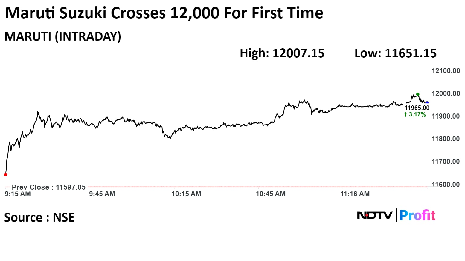 Maruti Suzuki India Ltd. rose 3.54% to Rs 12,007.15, the highest level since its listing on Jul 9, 2023. It was trading 3.09% higher at Rs 11,954.90 as of 11:52 a.m., as compared to 0.12% advance on the NSE Nifty 50 index.
