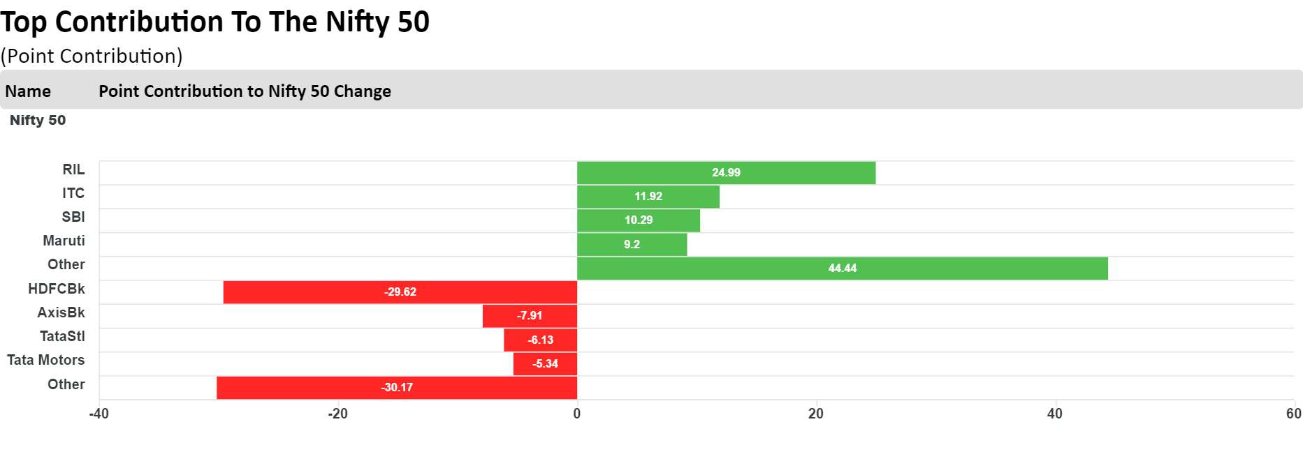 Reliance Industries Ltd., ITC Ltd., State Bank of India, Maruti Suzuki India Ltd., and Power Grid Corp of India added positively to the benchmark indices.