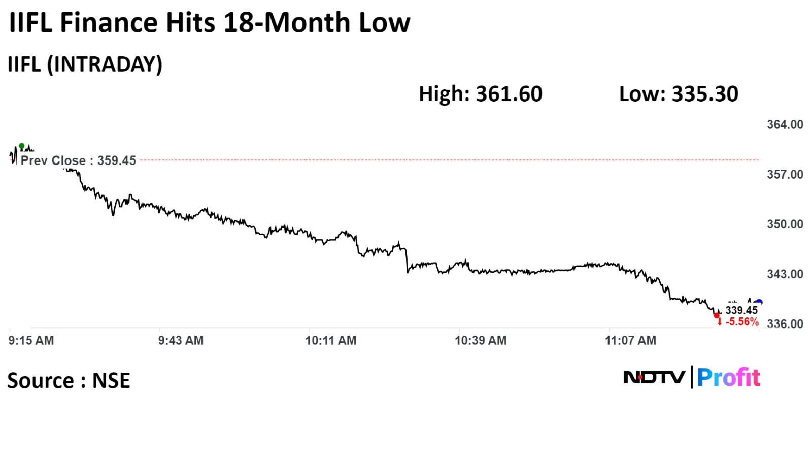 IIFL Finance Ltd. fell as much as 6.72% to Rs 335.30 apiece, the lowest level since Sep 12, 2022. It was trading 5.48% lower at Rs 339.75 apiece, as of 12:04 p.m. This compares to a 0.12% advance in the NSE Nifty 50 Index.