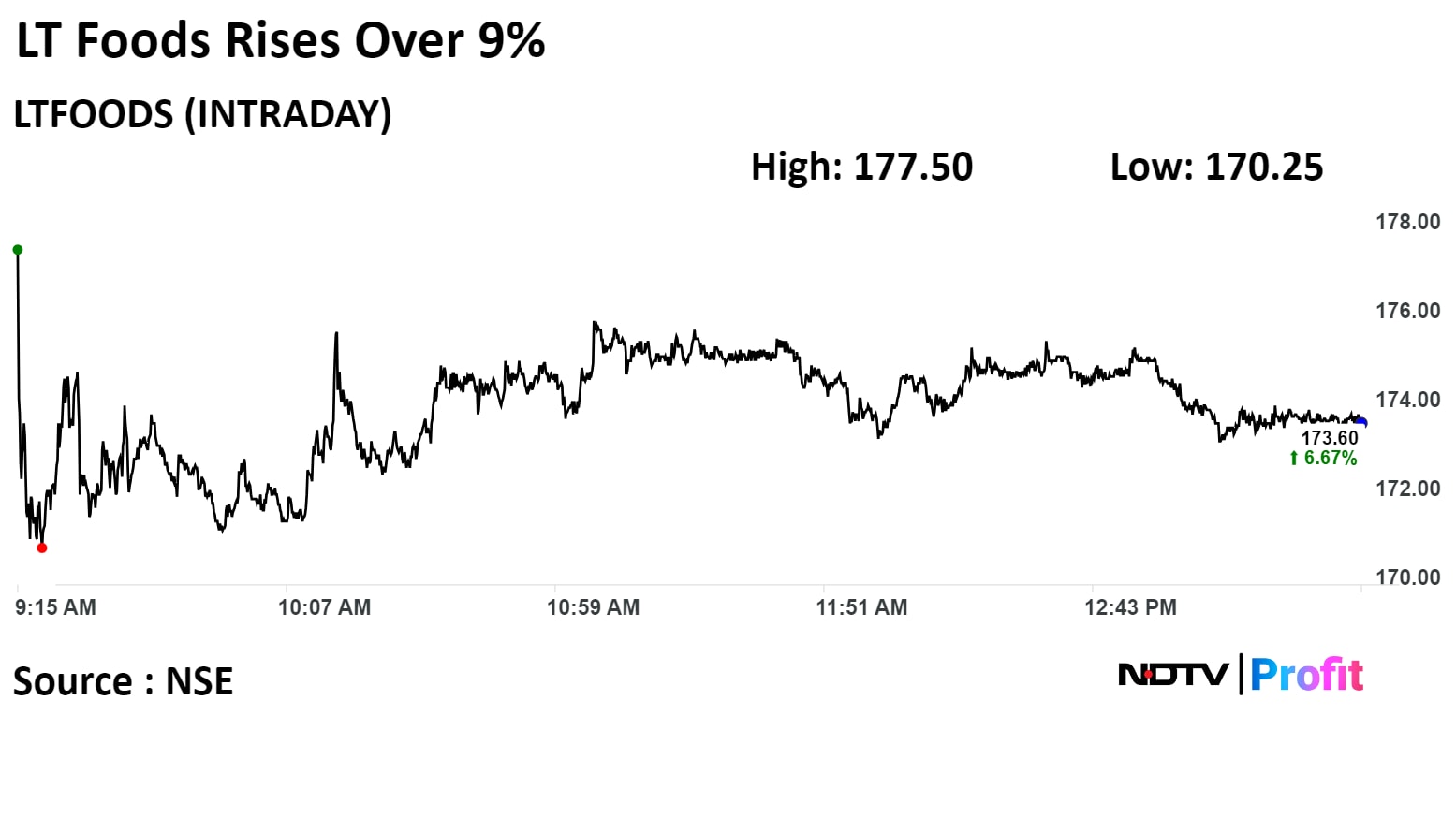 LT Foods Ltd. rose as much as 9.06% to Rs 177.50 apiece, the highest level since March 13. It was trading 6.70% higher at Rs 173.65 apiece, as of 1:36 p.m. This compares to a 0.29% advance in the NSE Nifty 50 Index.