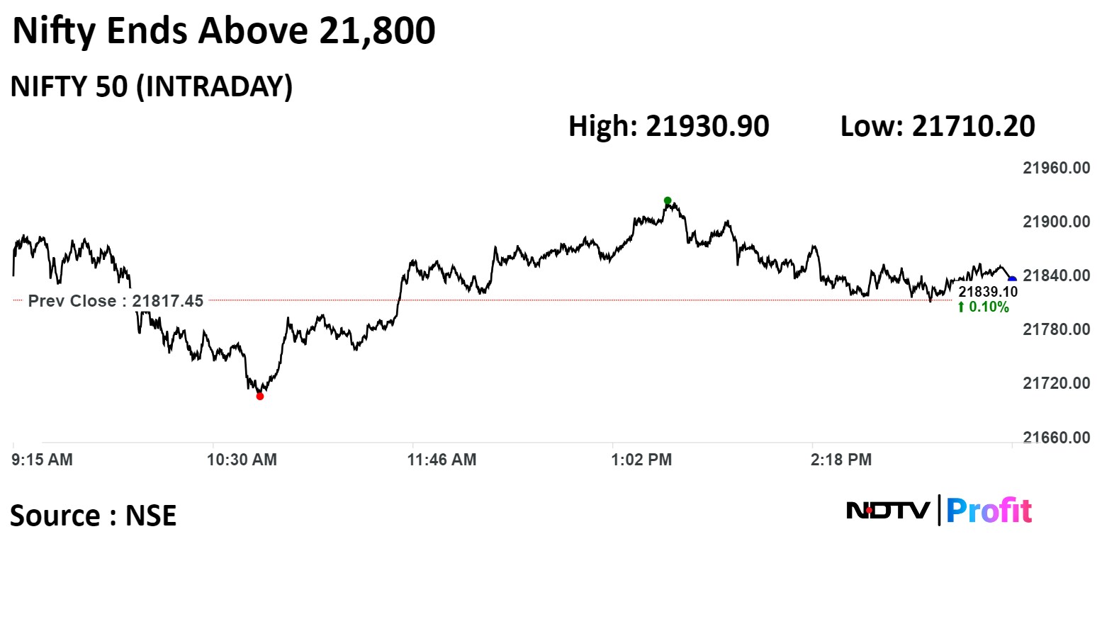 The NSE Nifty 50 settled 21.65 points, or 0.10% higher at 21,839.10, and the S&P BSE Sensex ended 89.64 points, or 0.12% higher at 72,101.69.