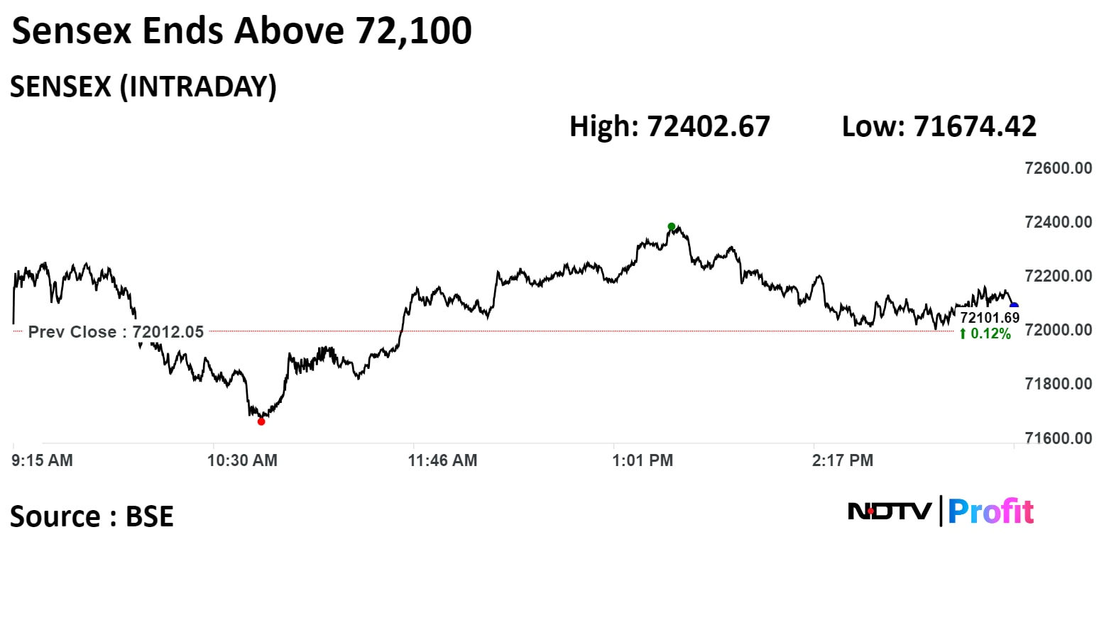 The NSE Nifty 50 settled 21.65 points or 0.099% higher 21,839.10, and the S&P BSE Sensex ended 89.64 points or 0.12% up at 72,101.69.
