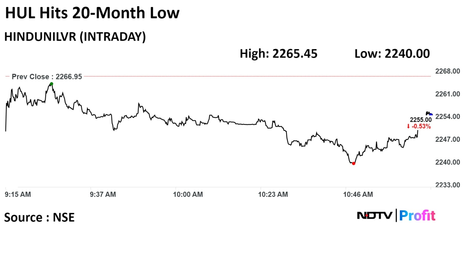 Hindustan Unilever Ltd. declined 1.19% to Rs 2,240.00, the lowest level since Jul 1, 2022. It was trading 0.66% down at Rs 2,252 as of 11:23 a.m., which compares to decline 0.23% decline in the NSE Nifty 50 index.