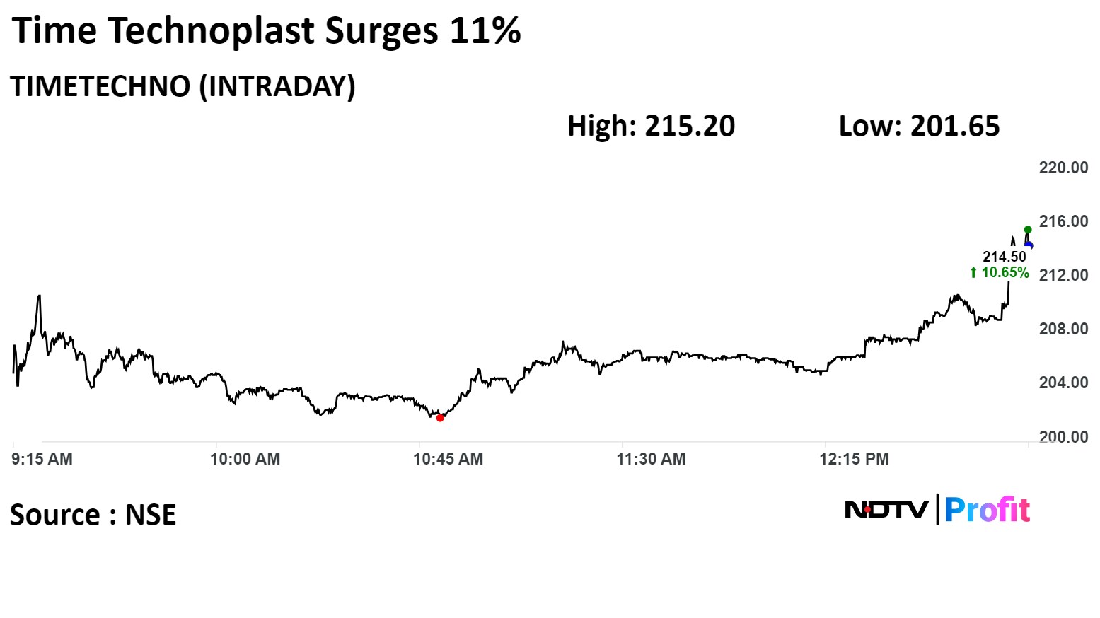Time Technoplast rose as much as 11.01% to Rs 215.20 apiece, the highest level since March 11. It was trading 10.21% higher at Rs 213.65 apiece, as of 1:02 p.m. This compares to a 0.24% advance in the NSE Nifty 50 Index.