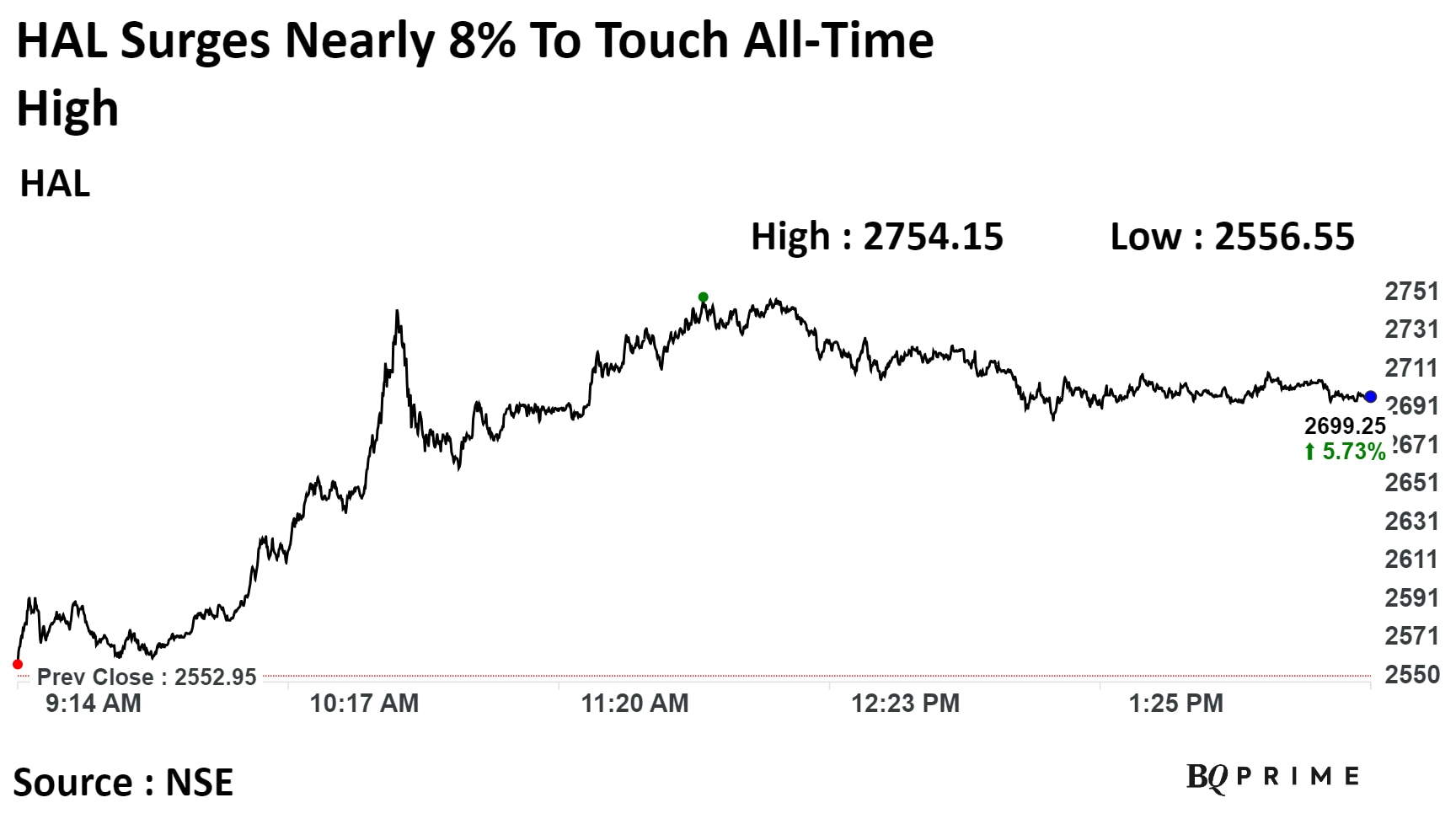 HAL's stock rose as much as 7.88% during the day to Rs 2,754 apiece, the highest level since its listing on the exchanges on Mar 27, 2018. It pared gains to trade 5.76% higher at Rs 2,700 apiece, as of 02:23 p.m. This compares to a 0.43% advance in the NSE Nifty 50 Index.