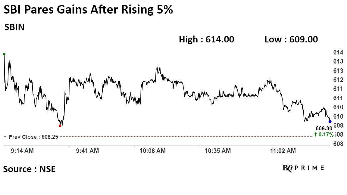 SBI shares rose as much as 5.75% to Rs 614 apiece to reach 52-week high, the highest level since August. It pared gains to trade 0.30% higher at Rs 610 apiece, as of 11:13 a.m. This compares to a 0.20% advance in the NSE Nifty 50 Index.