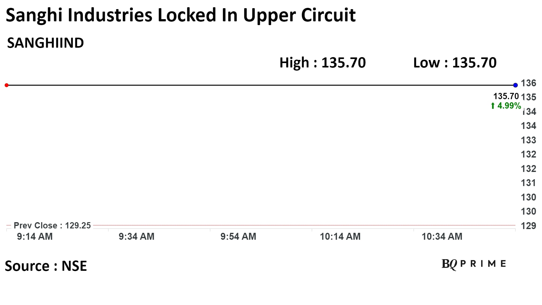 Shares of Sanghi Industries were locked in upper circuit of 4.99% at Rs 135.70 apiece, as of 10:49 a.m. This compares to a 0.33% advance in the NSE Nifty 50.