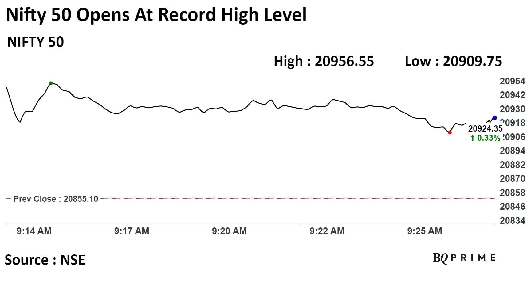 At 09:25 a.m., the NSE Nifty 50 was 77.60 points, or 0.37% higher, at 20,934.85, , while the S&P BSE Sensex was trading 214.08 points, or 0.32% higher at 69,515.65.