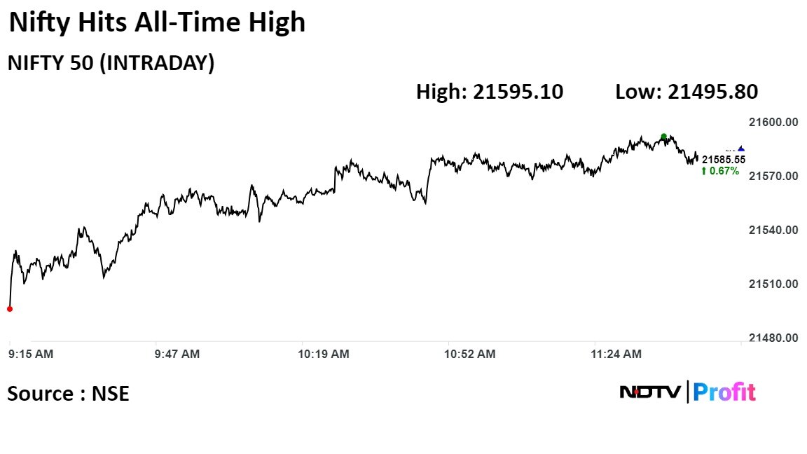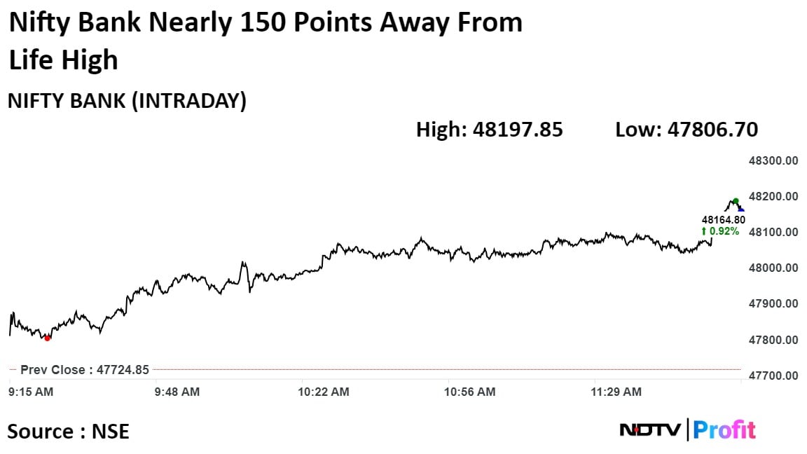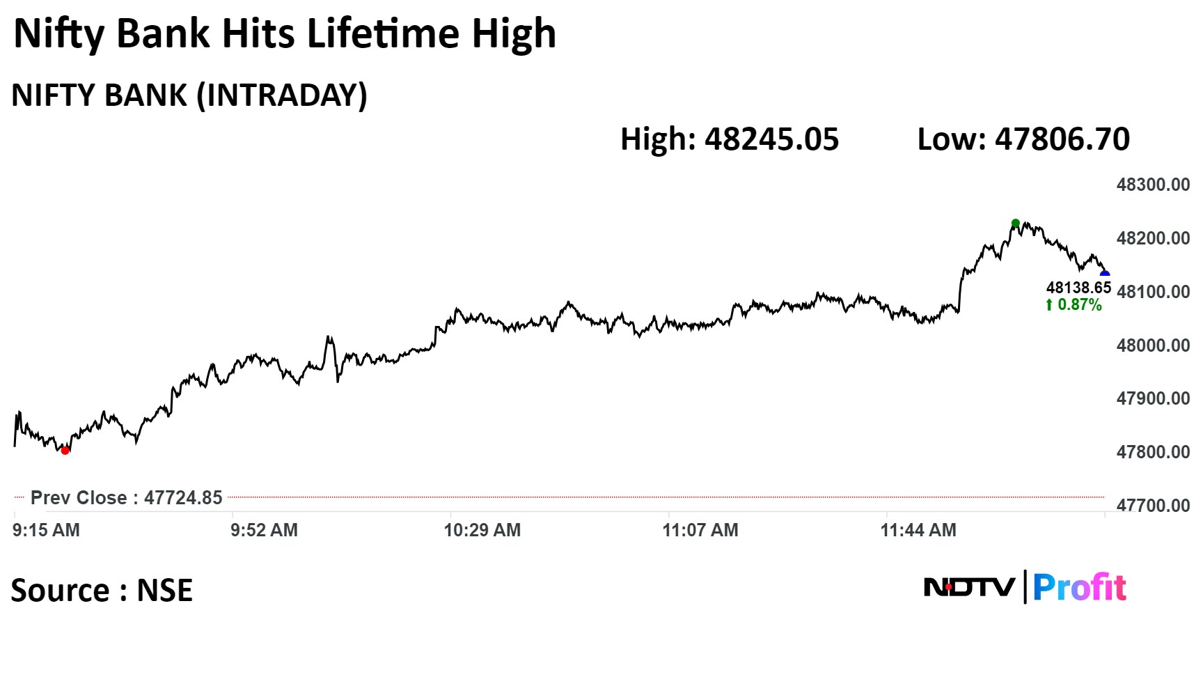 The benchmark NSE Nifty 50 extended gains through midday and hit a new lifetime high on Wednesday, with banking stocks contributing the most to the gains. Sensex also extended gains and was trading 100 points away from its lifetime high.