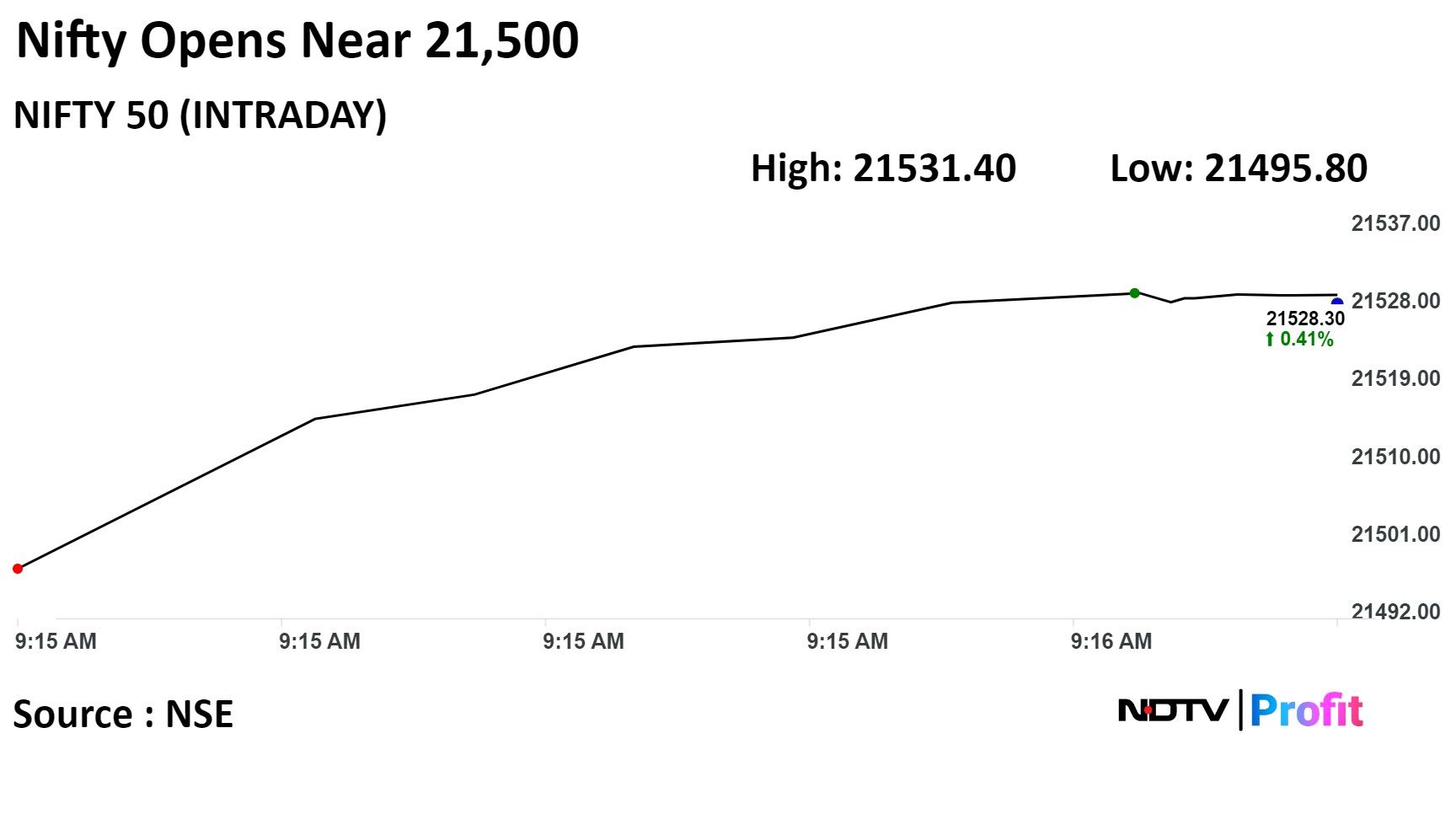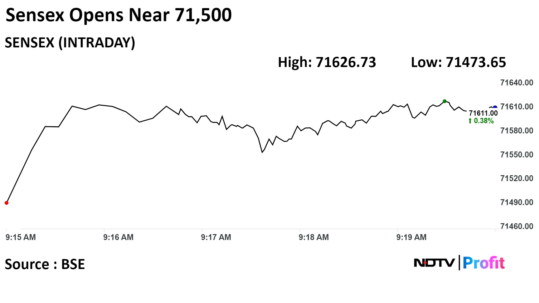 At pre-open, the S&P BSE Sensex Index was up 142.87 points, or 0.20%, at 71,479.67, while the NSE Nifty 50 was 56.30 points or 0.26% higher at 21,497.65.