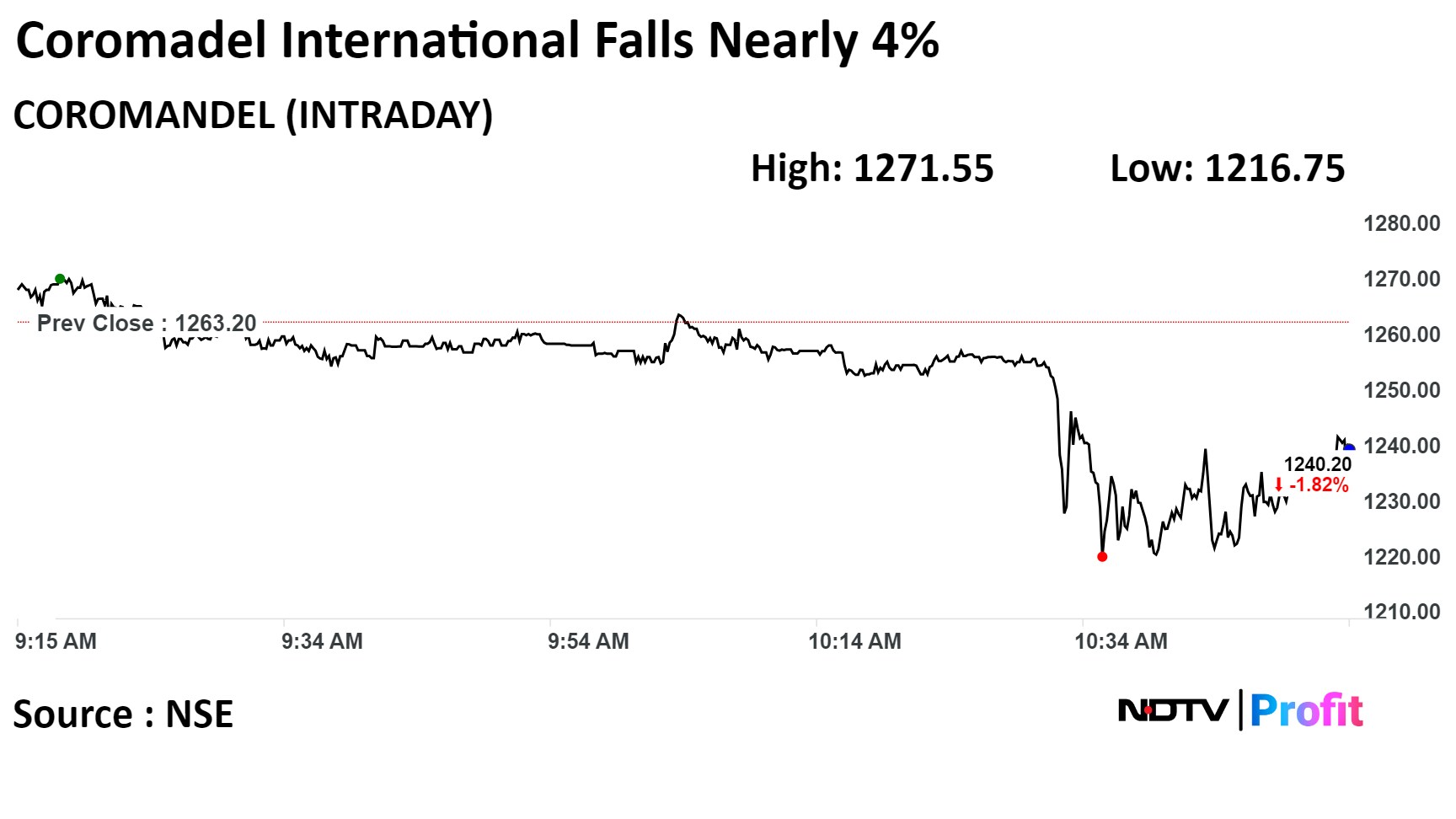 Shares of Coromandel International Ltd. fell nearly 4% after PTI reported that Ammonia gas leaked from a fertiliser manufacturing unit at Ennore in north Chennai and several people have been hospitalised.