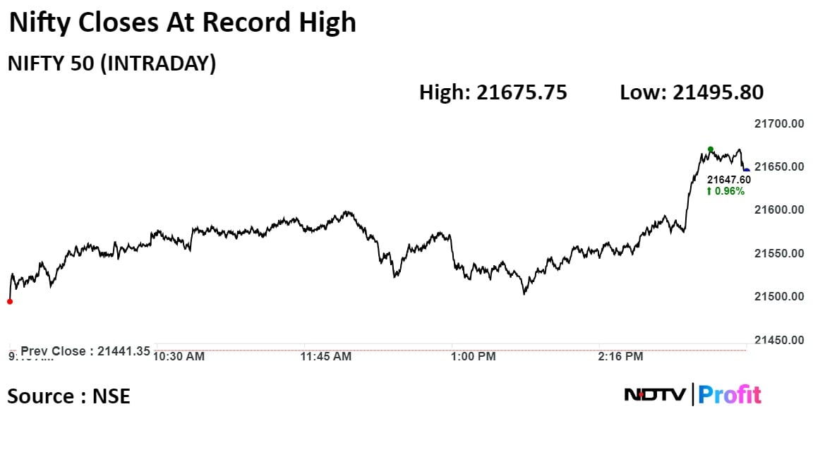 The NSE Nifty 50 ended 91.95 points, or 0.43%, higher at 21,441.35, while the S&P BSE Sensex closed 229.84 points, or 0.32%, up at 71,336.80.