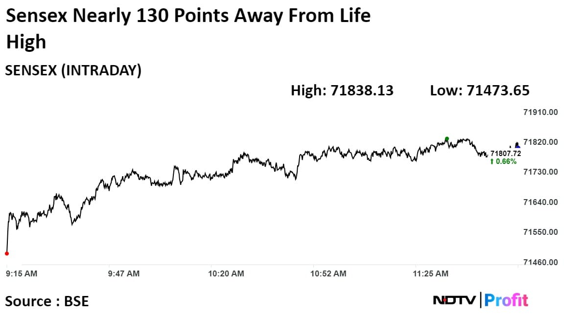 As of 12:08 p.m., Nifty was 158.85 points, or 0.74% higher at 21,600.20, while Sensex was up 523.05 points, or 0.73% at 71,859.85.
