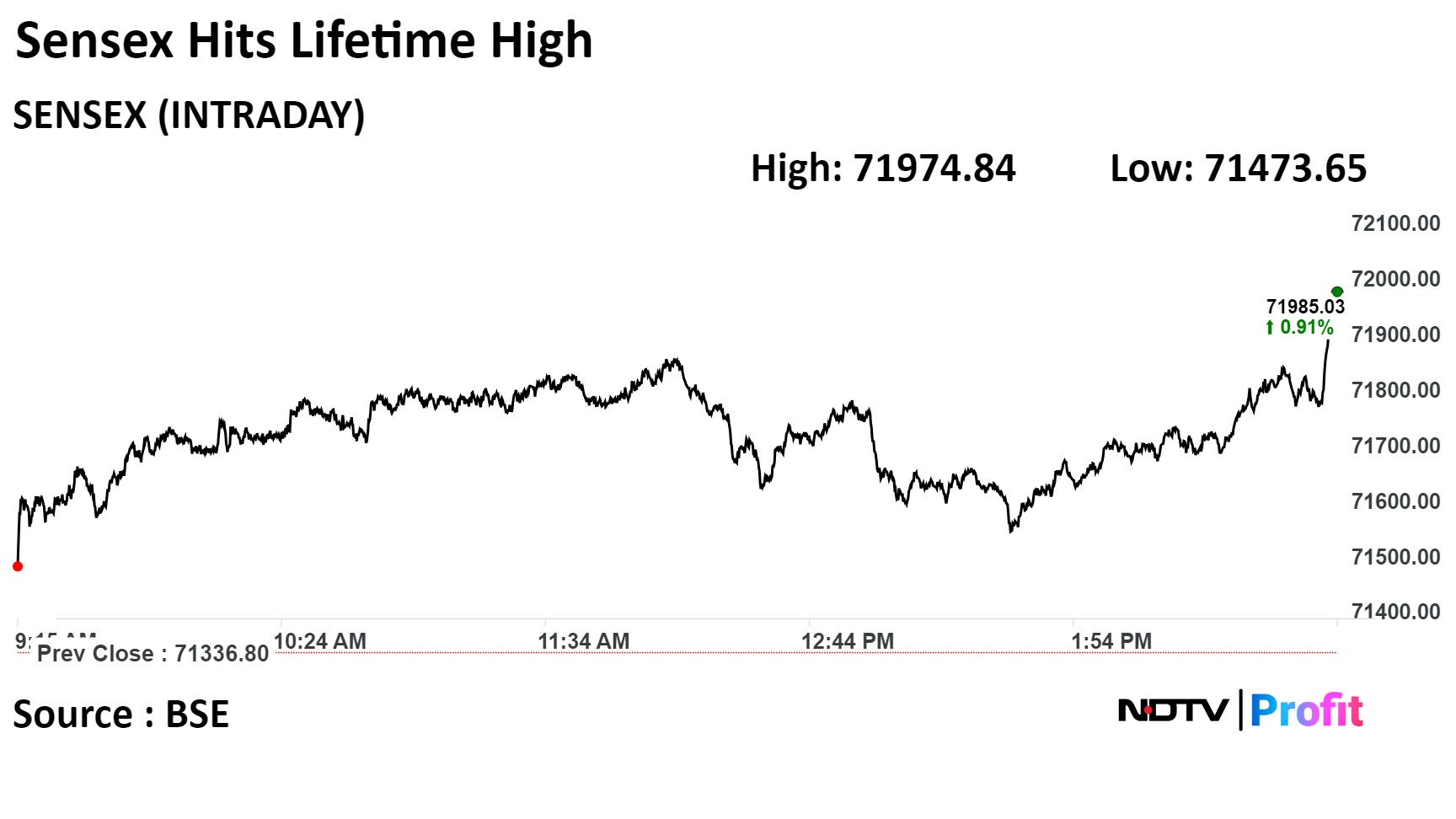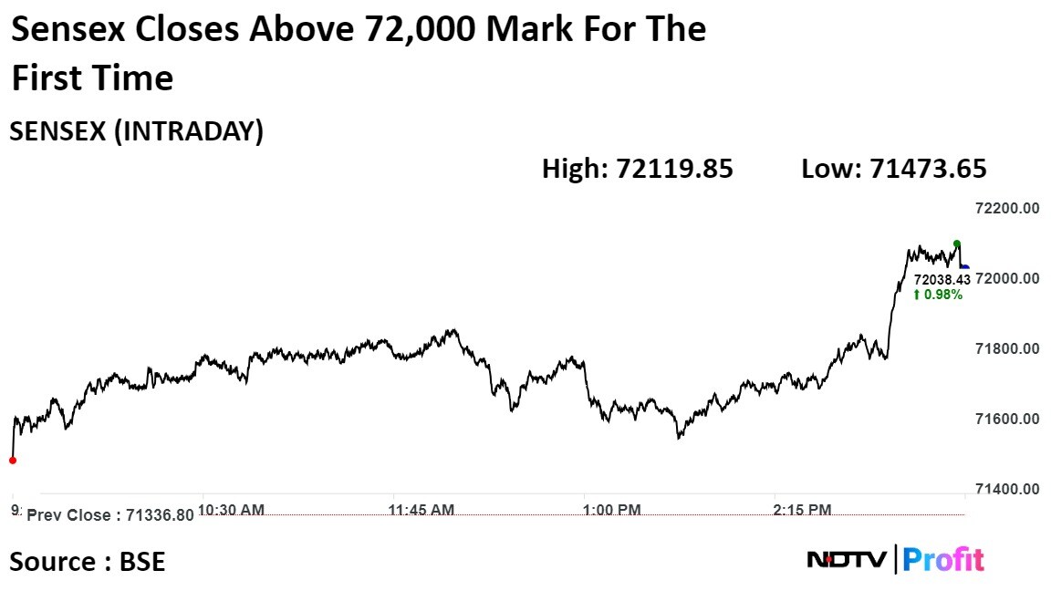 The Nifty 50 rose 213.40 points or 1% to record the highest closing of 21,654.75 points and the Sensex ended at 72,038.43 for the first time up 0.98% or 701.63 points. Intraday, the Nifty renewed its lifetime high to 21.675.75 points and the Sensex hit 72,119.85, its all-time high level.