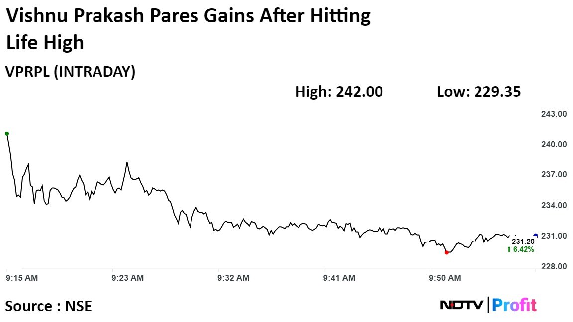 The scrip rose as much as 11.39% to 242 apiece, to reach a new life high. This is the highest level since Dec. 15, 2023. It pared gains to trade 6.19% higher at Rs 230.70 apiece, as of 9:54 a.m. This compares to a 0.57 advance in the NSE Nifty 50 Index.