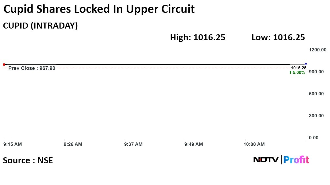 Shares of Cupid Ltd were locked in an upper circuit on Wednesday after Columbia Petrol Chem Pvt. Ltd and Aditya Halwasiya acquired stake in the company.