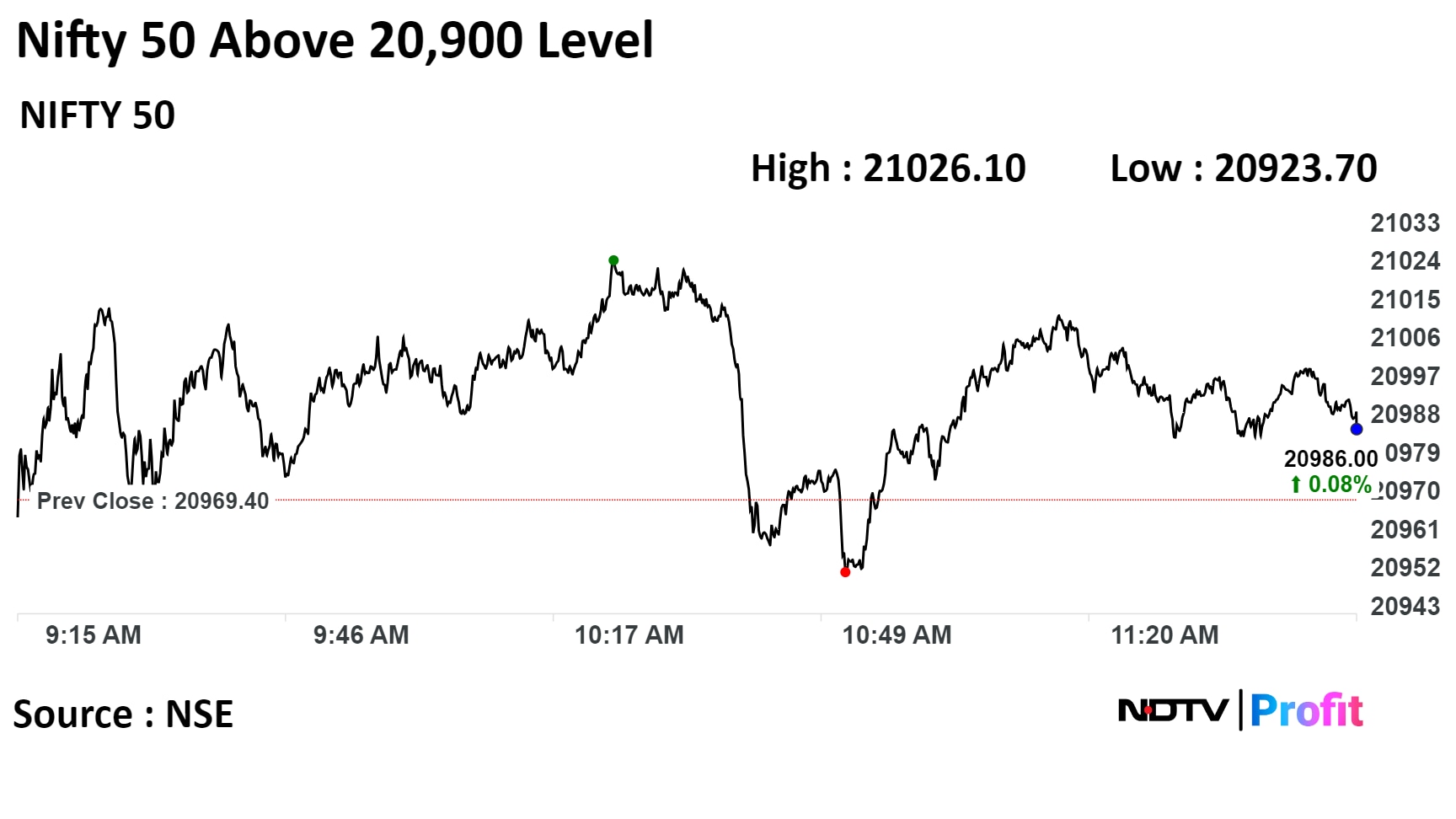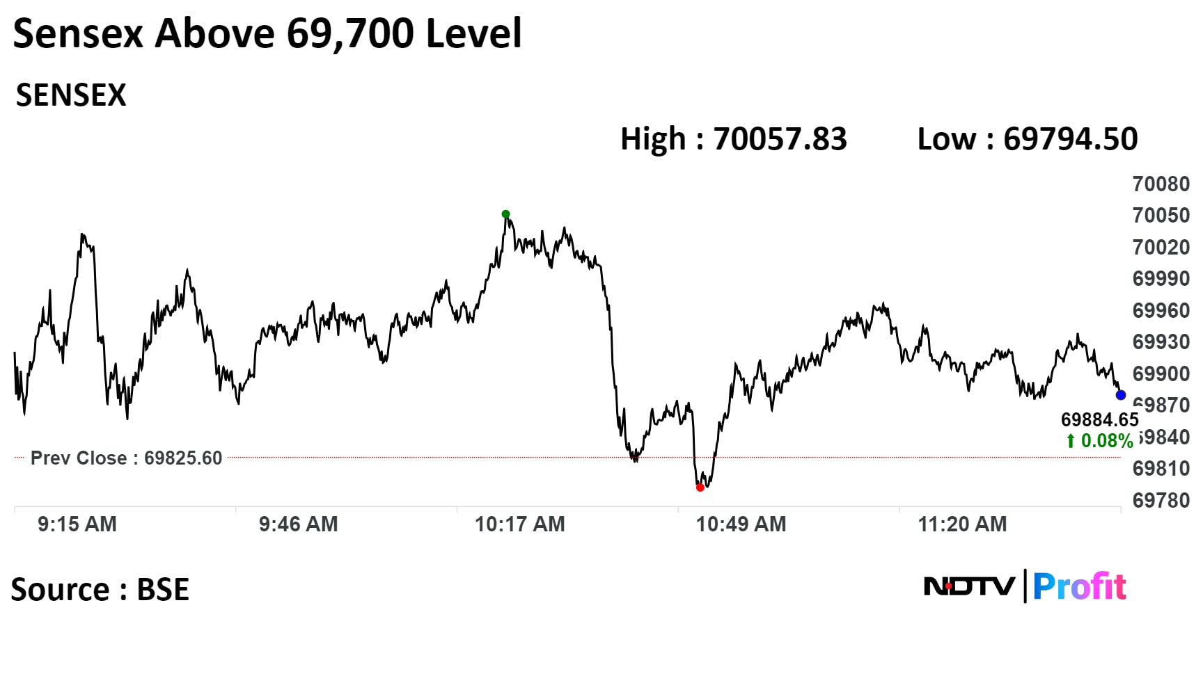 As of 11:49 a.m., the Sensex was trading 80 points or 0.11% higher at 69,911.32, while the Nifty was 21.05 points or 0.1% up at 20,991.
