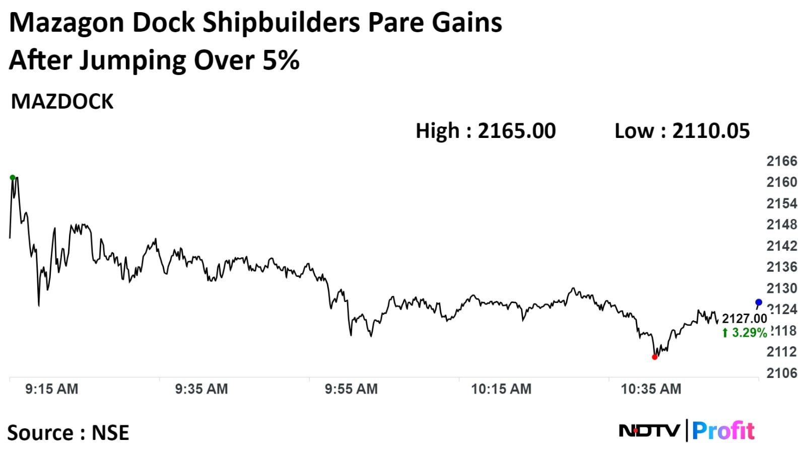 Mazagon Dock Shipbuilders' stock rose as much as 5.22% during the day to Rs 2,166.90 apiece on the NSE. It was trading 3.17 % higher at Rs 2,124.55 apiece compared to a 0.02% advance in the benchmark Nifty 50 as of 10.48 a.m.