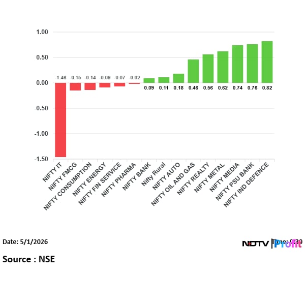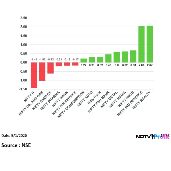 Most sectoral indices rose with Nifty realty and Nifty defence leading the gains, while Nifty IT and Nifty oil and gas were among the losers.