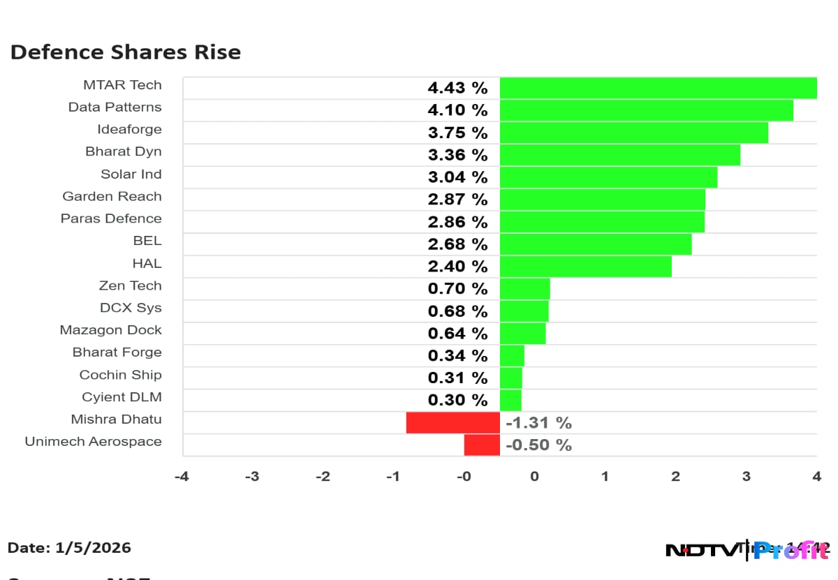 Most sectoral indices rose, led by Nifty Defence and Nifty Realty. Nifty IT and Nifty Energy were trading lower.