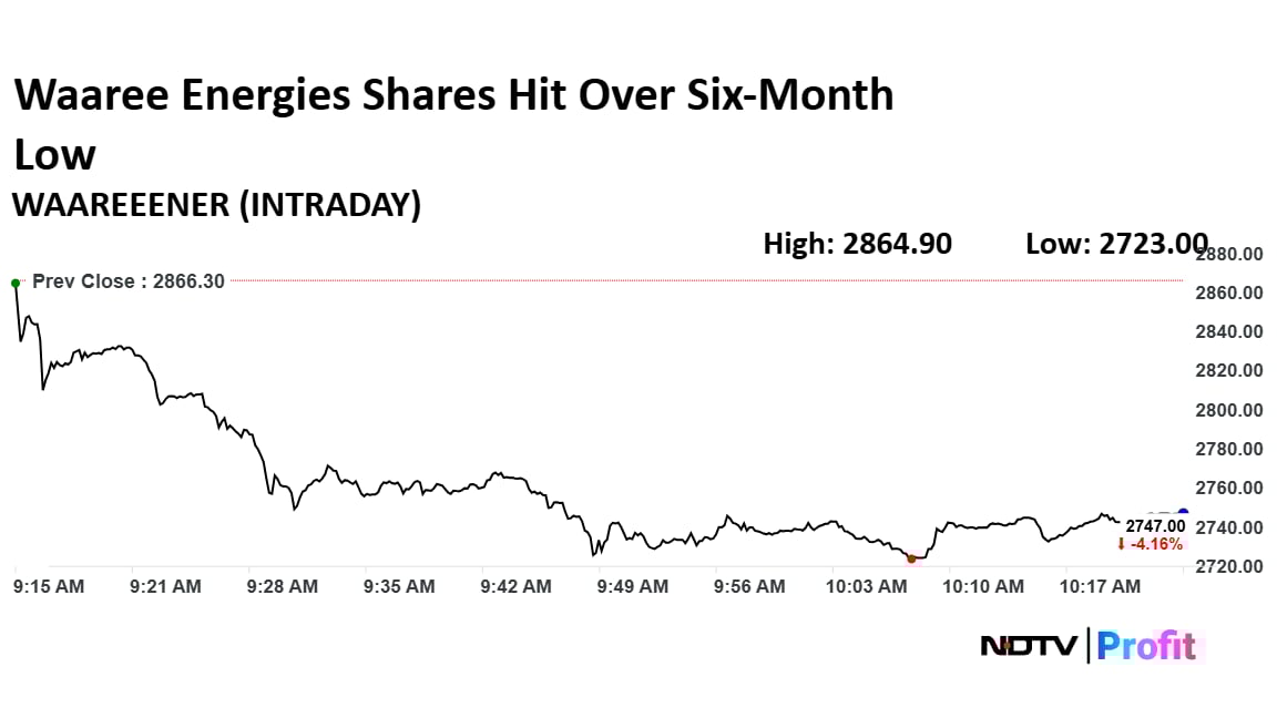 The shares of Waaree Energies fell as much as 5% to hit over six-month low on Monday, the lowest level since June 20. It pared losses to trade 4.30% lower at Rs 2,743 apiece, as of 10:27 a.m. This compares to a 0.15% advance in the NSE Nifty 50 Index.