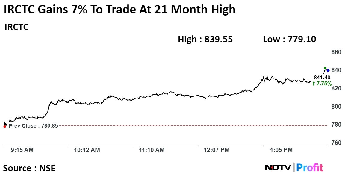 Shares of IRCTC rose as much as 8.13% to Rs 844.30 apiece highest in over one year. It last traded at the same levels on Feb. 1, 2022. The shares at 2:00 p.m. were trading 7.95% higher at Rs 842.95 apiece. This compares to a 0.13% decline in the NSE Nifty 50 Index.