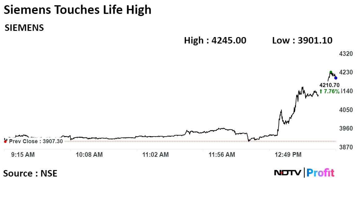 Siemens shares rose as much as 8.64% to Rs 4,245 apiece to reach its all time high as of 1:39 p.m. This compares to a 0.16% decline in the NSE Nifty 50 Index.