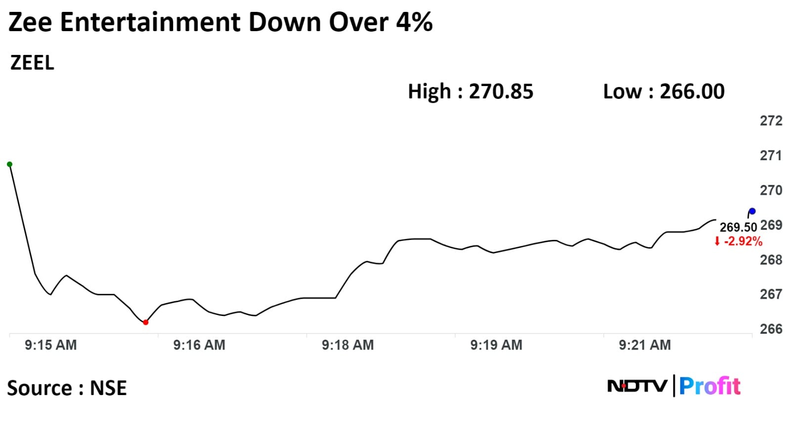 The scrip fell as much as 4.18% to Rs 266.00 apiece. It was trade 2.76% lower at Rs 269.95 apiece, as of 09:35 a.m. This compares to a 0.09% decline in the NSE Nifty 50 Index.