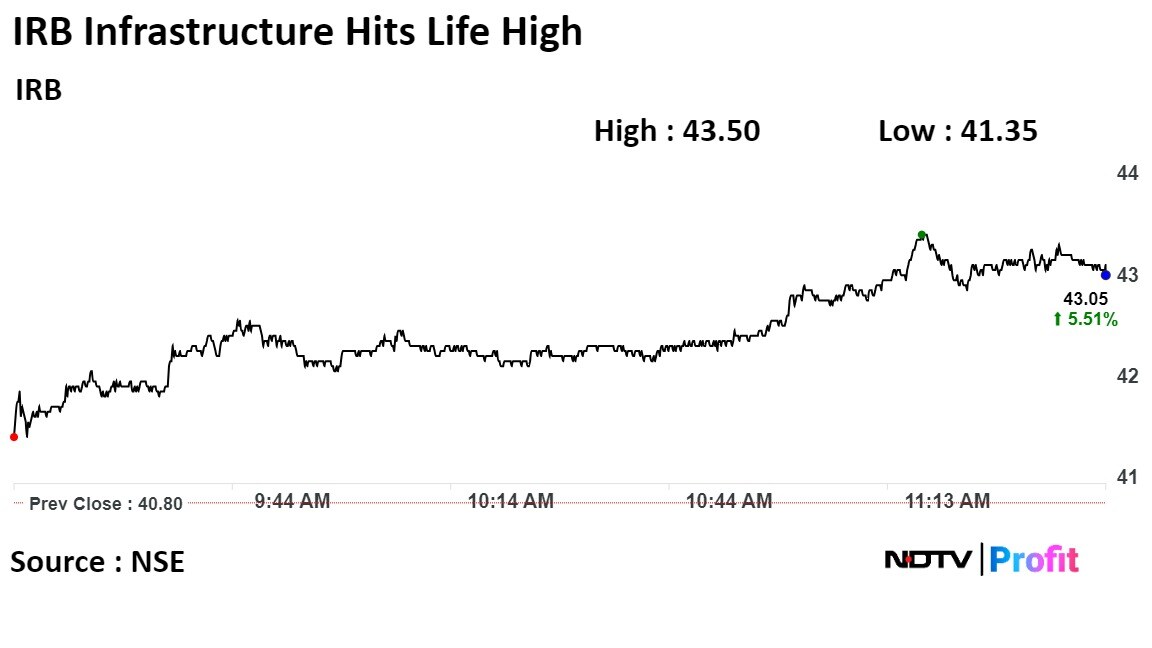 IRB Infrastructure shares rose as much as 6.62% to 43.50 apiece to reach its all-time high. It pared gains to trade 2.55% higher at Rs 43.35 apiece, as of 11:37 a.m. This compares to a 0.08% advance in the NSE Nifty 50 Index.