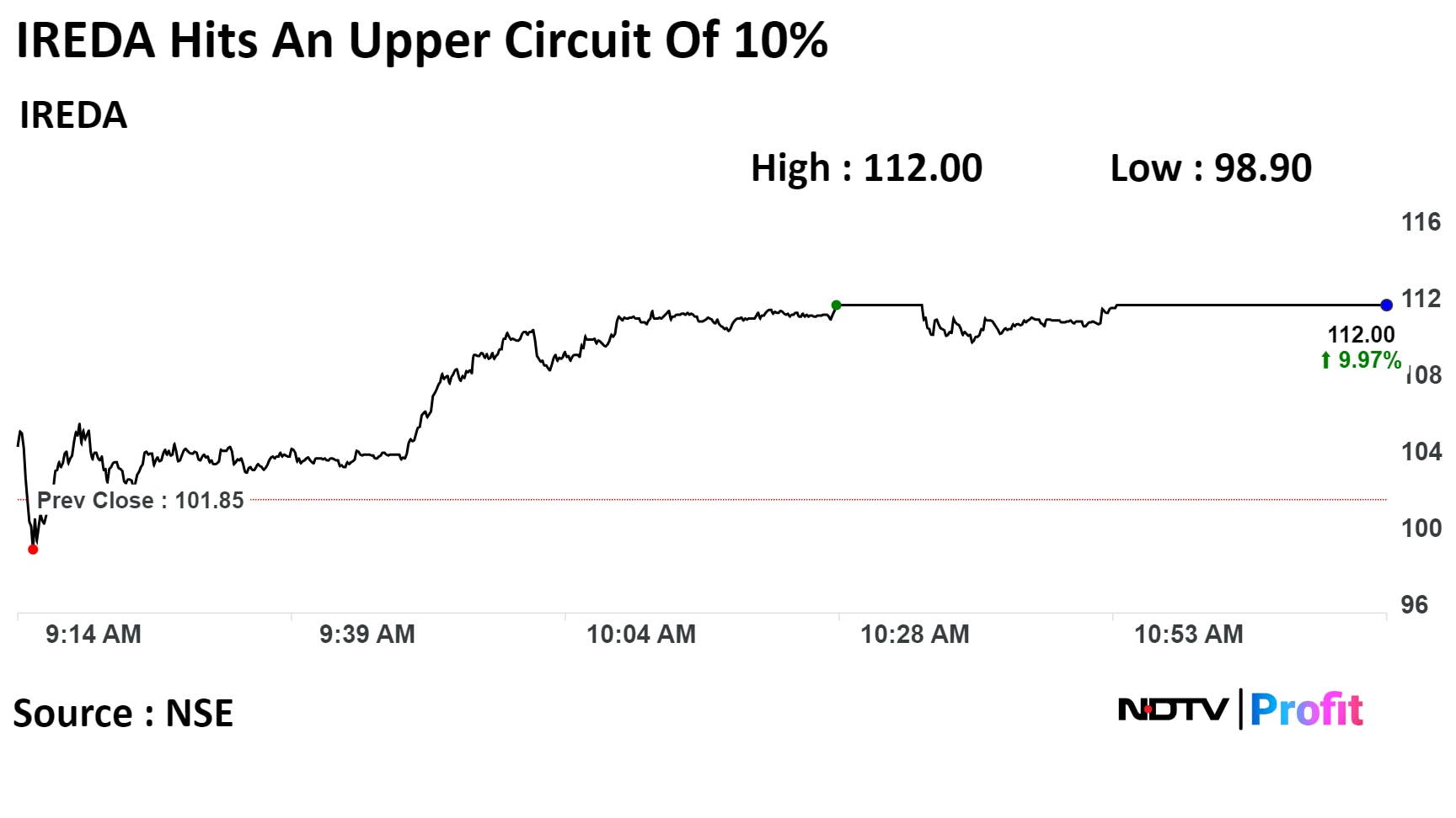The scrip surged 9.97% to Rs 112.00 apiece, the highest level since its listing on Nov 29, 2023. It was trading at upper circuit 9.97% higher at Rs 112.00 apiece, as of 11:13 a.m. This compares to a 0.35% decline in the NSE Nifty 50 Index.