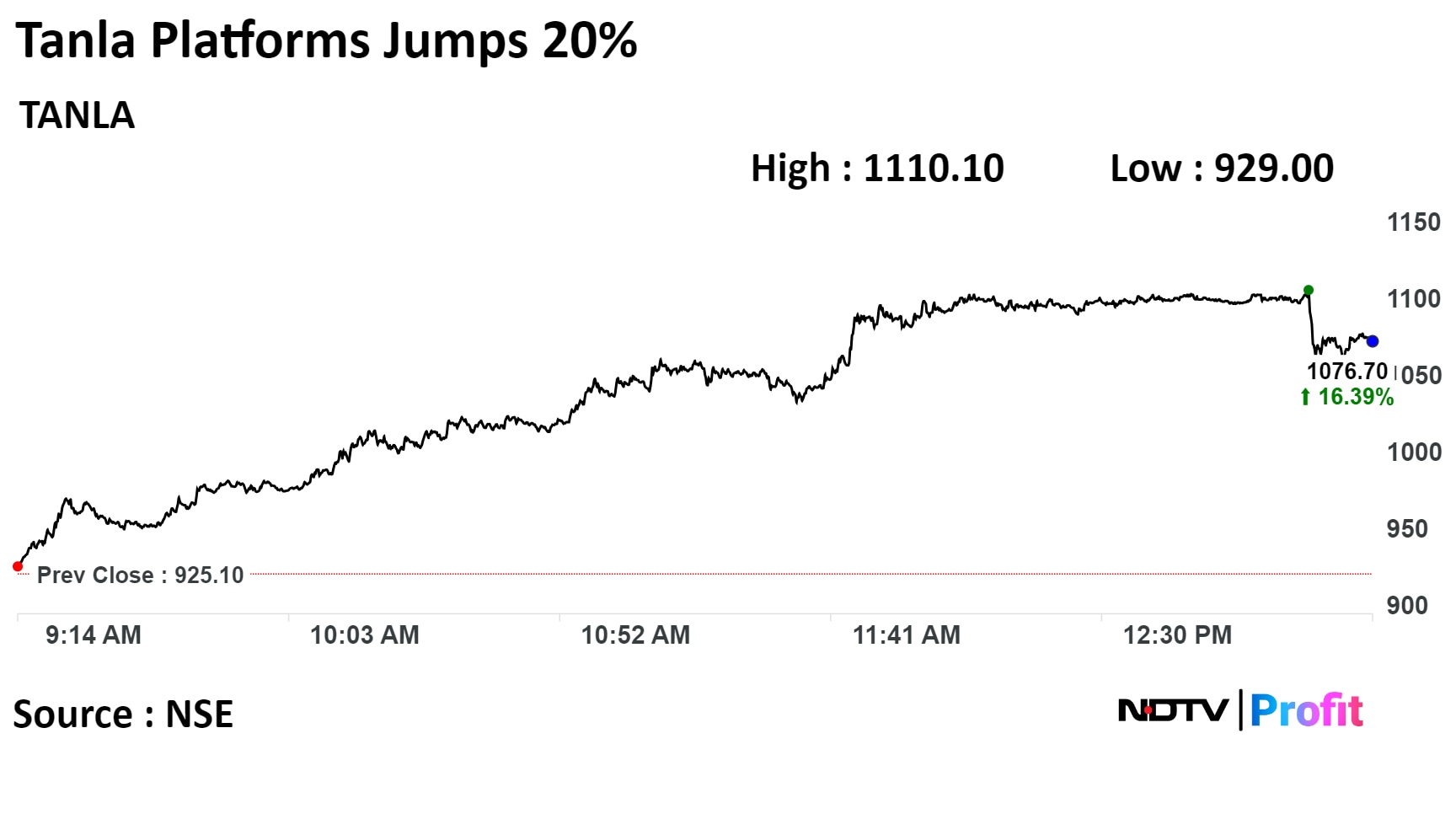 Tanla Platforms Ltd. stock rose as much as 20% during the day to Rs 1,110 apiece. The shares were trading 16.51% higher at Rs 1,077.85 apiece compared to a 0.39% decline in the benchmark Nifty 50 at 1:17 p.m.