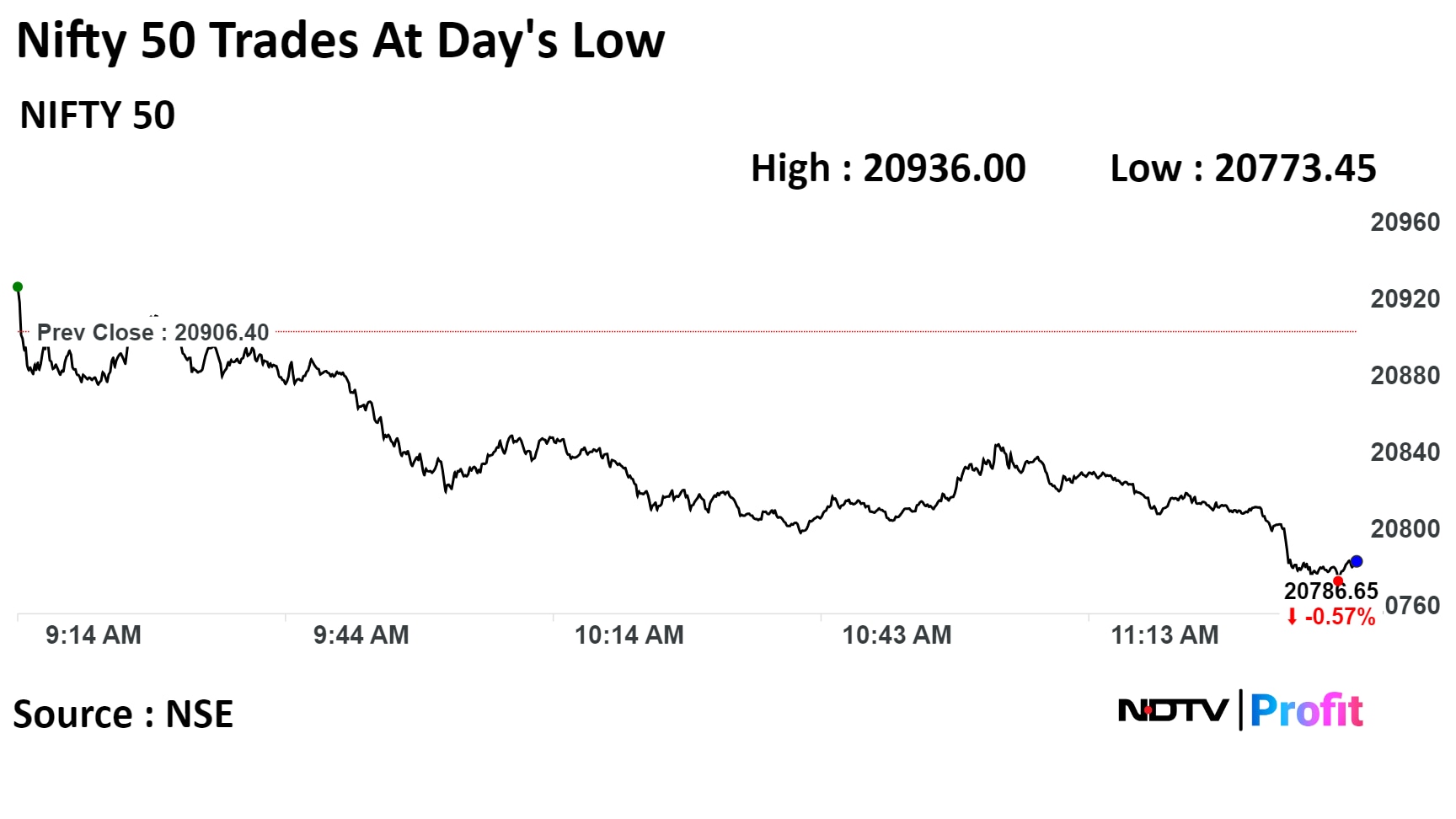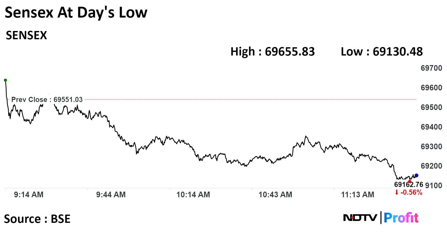 As of 12:18 p.m., S&P BSE Sensex was 424.41 points, or 0.62% lower at 69,117.87, while the NSE Nifty 50 was down 130.95 points or 0.63% at 20,774.34.