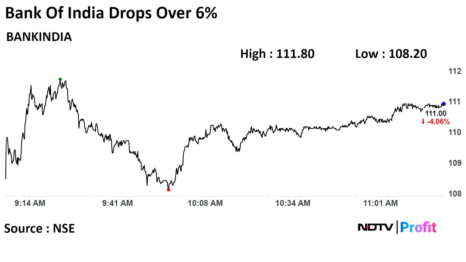 Bank Of India stock fell as much as 6.48% during the day on the NSE, to Rs 108.20 apiece, the lowest since Oct 23, when it fell over 9%. The stock was trading 4.11% lower at Rs 110.95 apiece compared to a 0.42% advance in the benchmark Nifty 50 at 11:24 a.m.