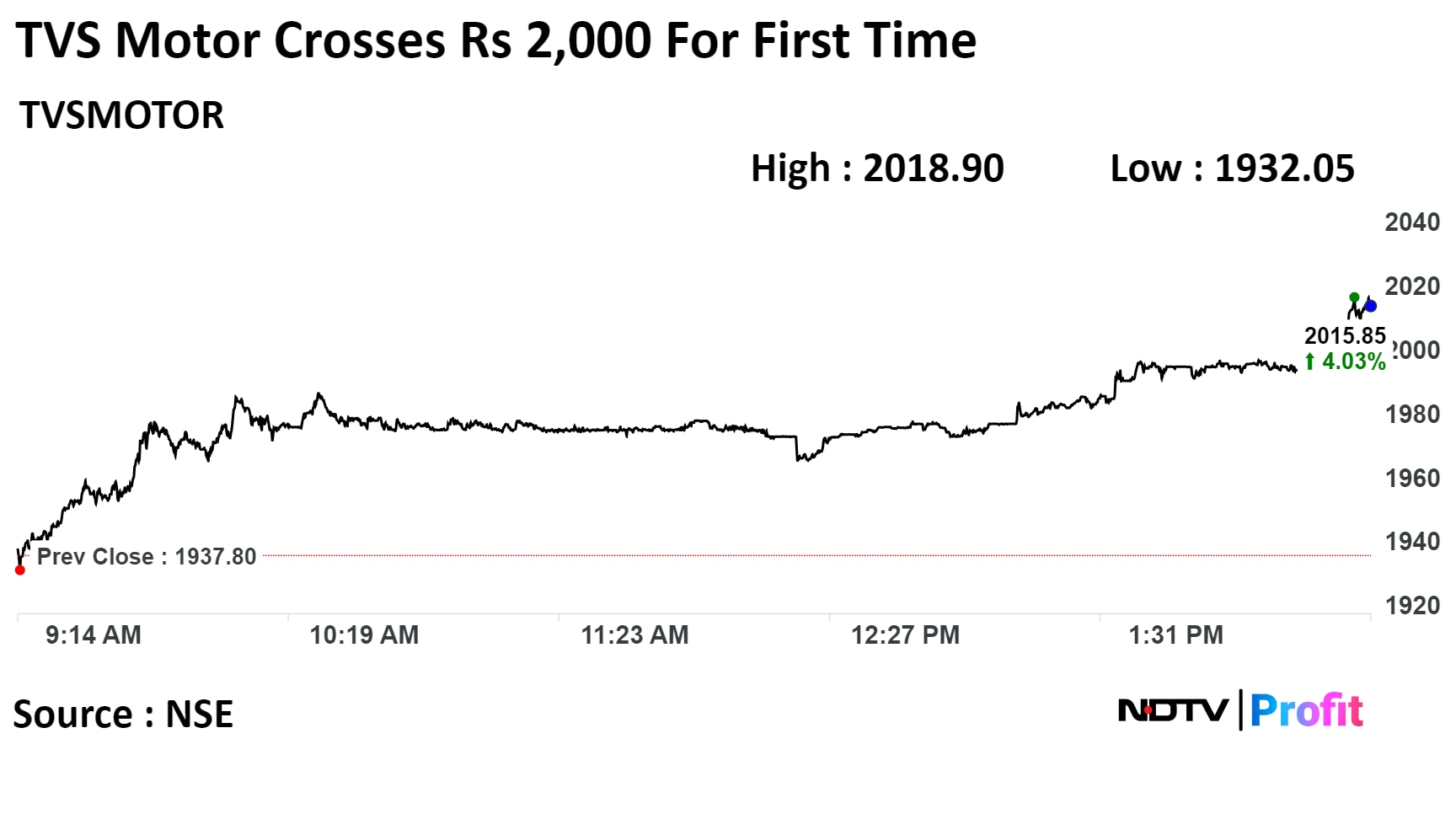 TVS Motor Company Ltd. rose as much as 3.35% to Rs 2,002 apiece, since it's listing on Jul 10, 2000. It was trading 3.39% higher at Rs 2,003 apiece, as of 2:29 p.m. This compares to a 0.15 decline in the NSE Nifty 50 Index as of 2:29 p.m.