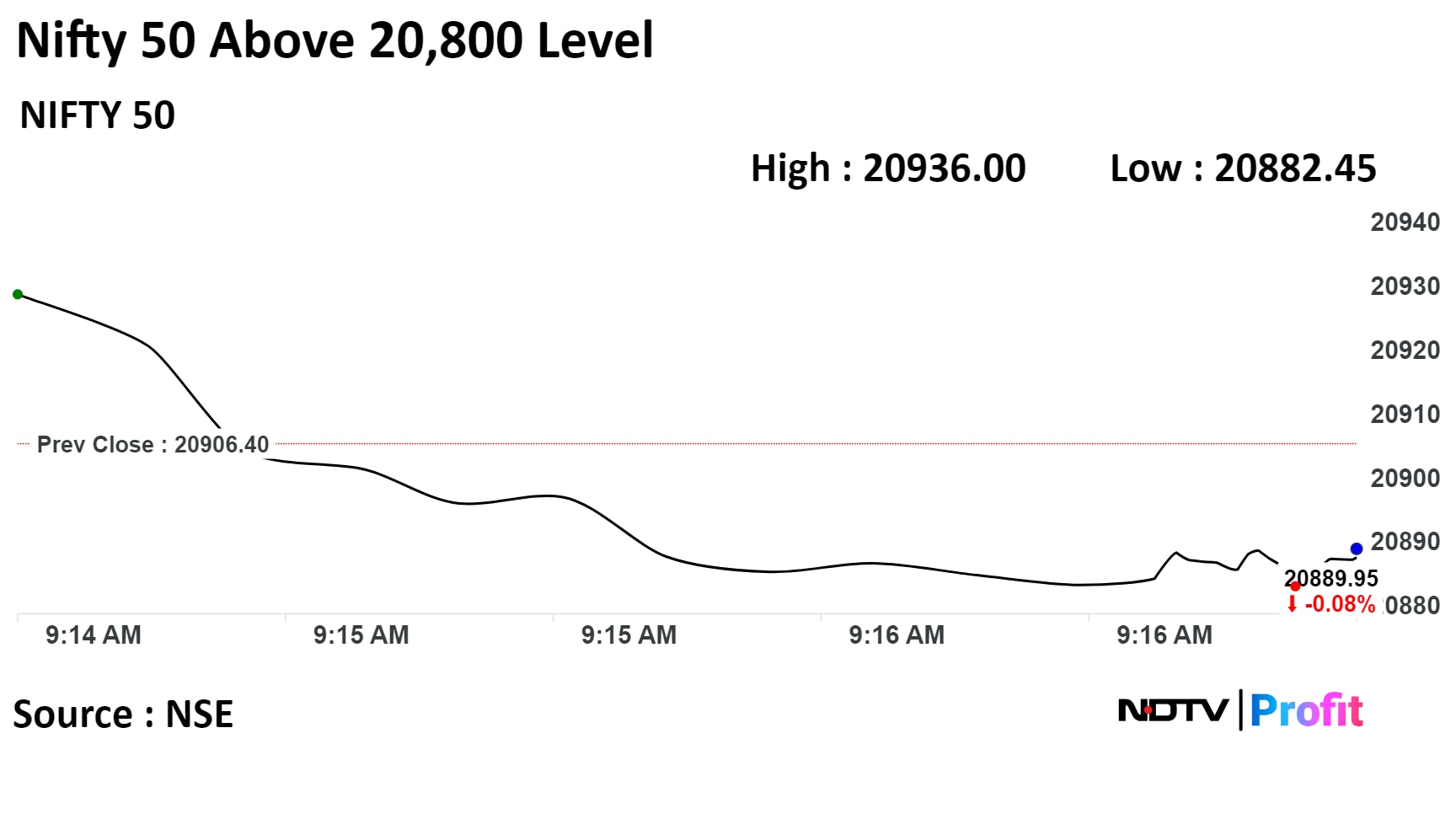 The NSE Nifty 50 was 20.10 points, or 0.1% lower, at 20,886.30, while the S&P BSE Sensex was trading 108.23 points, or 0.16% lower at 69,442.80.