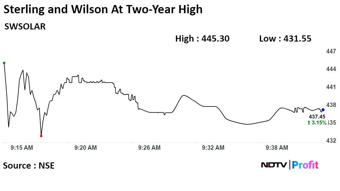 Sterling and Wilson Renewable Energy shares rose as much as 5% to 445.30 apiece, the highest in over two years. It last traded at this levels on Nov. 10 2021. It pared gains to trade 3.02% higher at Rs 436.90 apiece, as of 9:35 a.m. This compares to a 0.29% advance in the NSE Nifty 50 Index.