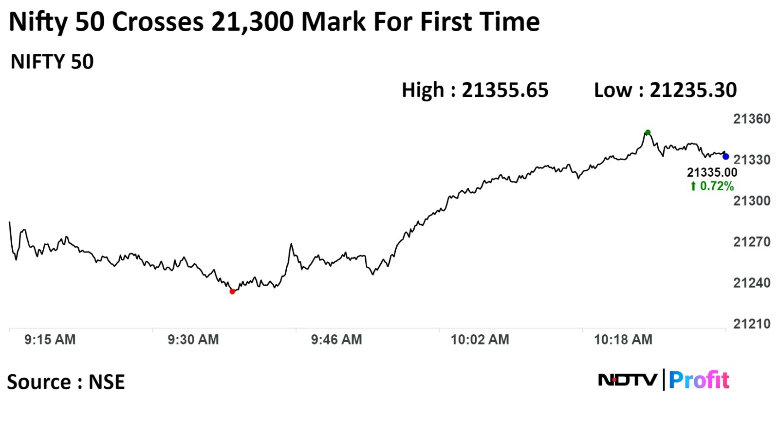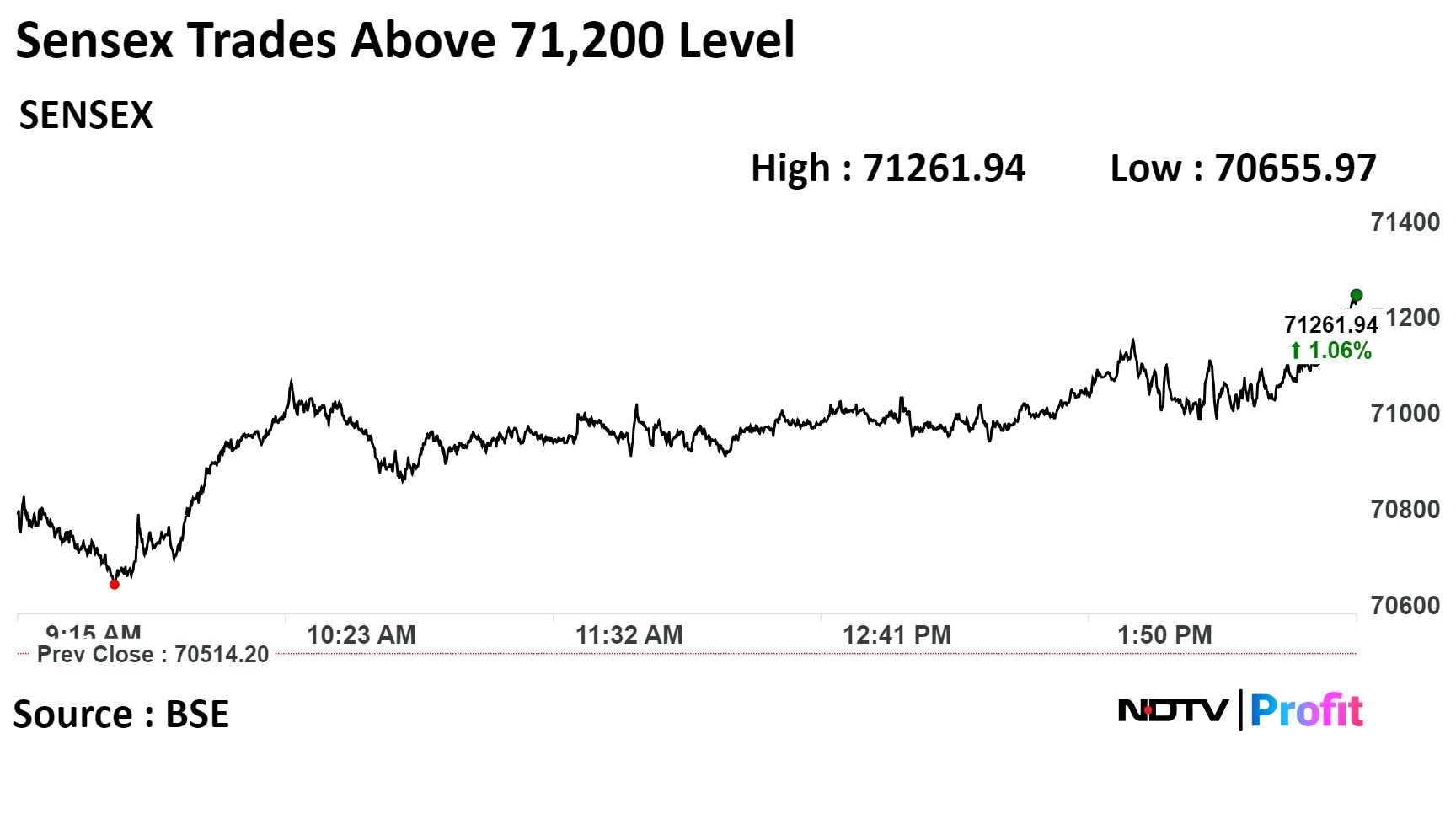 As of 11:45 a.m., the S&P BSE Sensex rose 462.86 points, or 0.66% at 70,977.06, while the NSE Nifty 50 was up 143.70 points or 0.68% at 21,326.40.