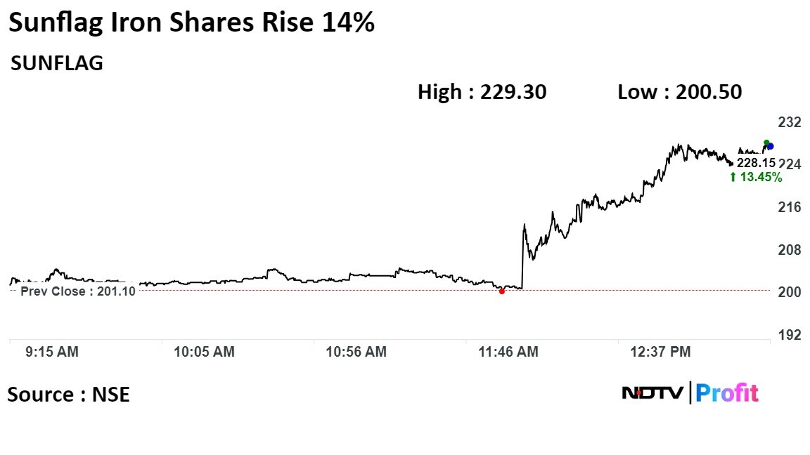 Sunflag Iron shares rose as much as 14.02% to Rs 229.30 apiece, it last traded at this level on Aug. 10, 2023. It pared gains to trade 12.53% higher at Rs 226.30 apiece, as of 1:23 a.m. This compares to a 0.072% advance in the NSE Nifty 50 Index.