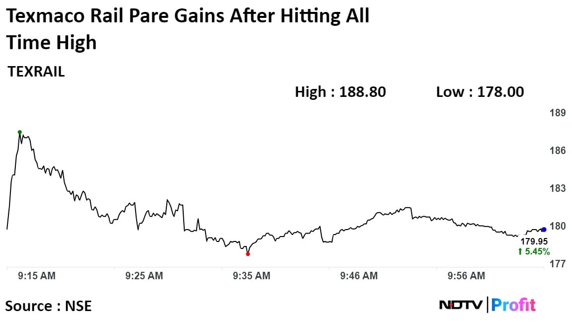 Texmaco Rail shares rose as much as 10.64% to Rs 188.80 apiece to reach its all time high. It pared gains to trade 5.60% higher at Rs 180.20 apiece, as of 10:00 a.m. This compares to a 0.072% advance in the NSE Nifty 50 Index.