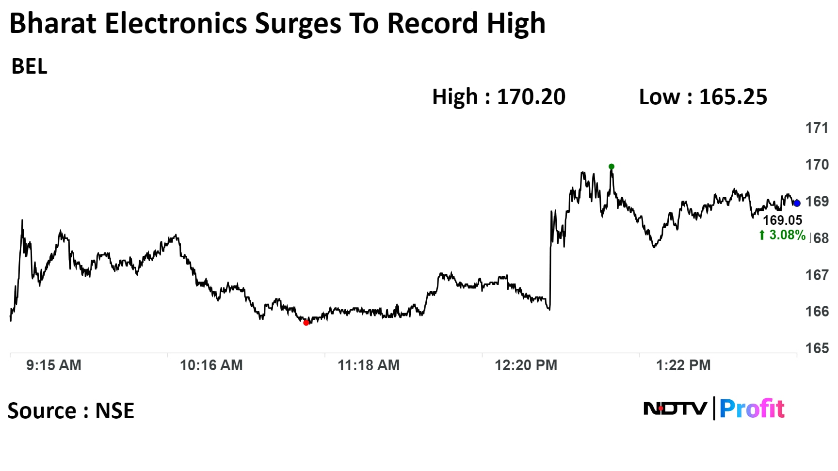 Shares of Bharat Electronics Ltd. soared over 3% to touch an all-time high after the Ministry of Defense signed an contract Friday with the company for procurement of electronic fuzes for the Indian army, according to a press release by the ministry.