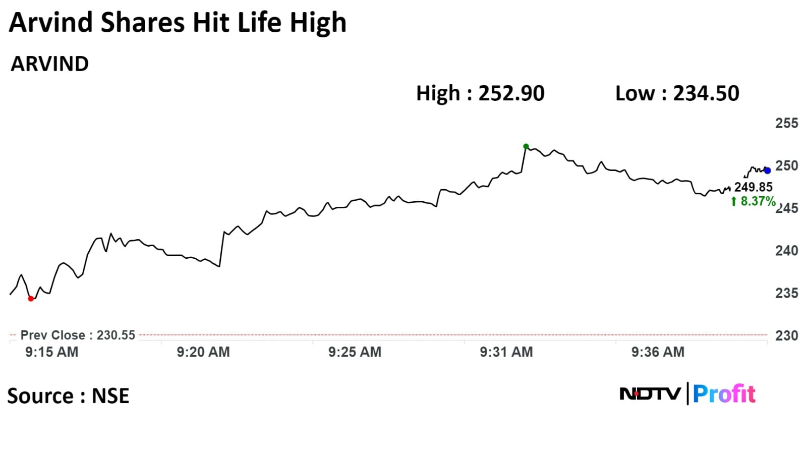 Shares of Arvind Ltd rose as much as 9.69% to Rs 252.90 apiece, its lifetime high level.