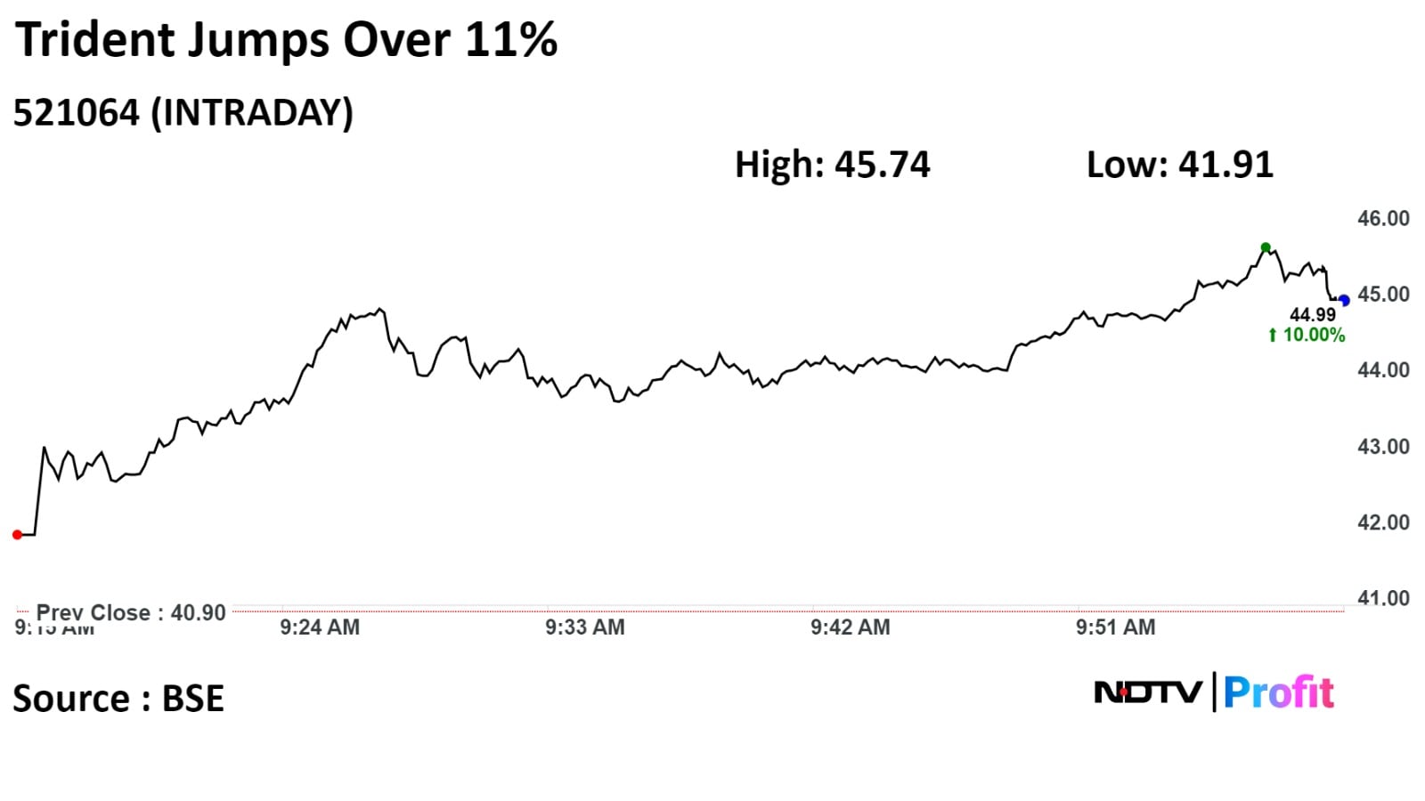 Shares of the company rose as much as 11.86% to Rs 45.75 apiece. It was trading 10.51% higher at Rs 45.05 apiece, compared to a 0.13% decline in the benchmark BSE Sensex at 10:02 a.m.